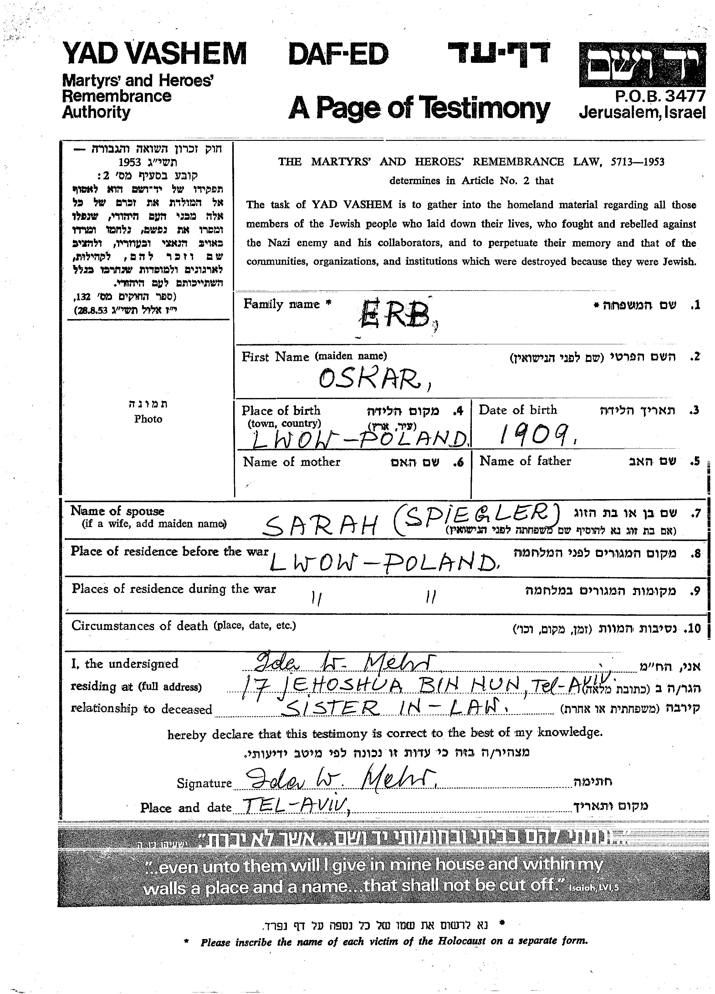 Oskar Erb was born in Lwow, Poland, 1909. He was married to Sarah nee Spiegler. Prior to WWII he lived in Lwow, Poland. During the war he was in Lwow, Poland. Oskar was murdered in the Shoah.