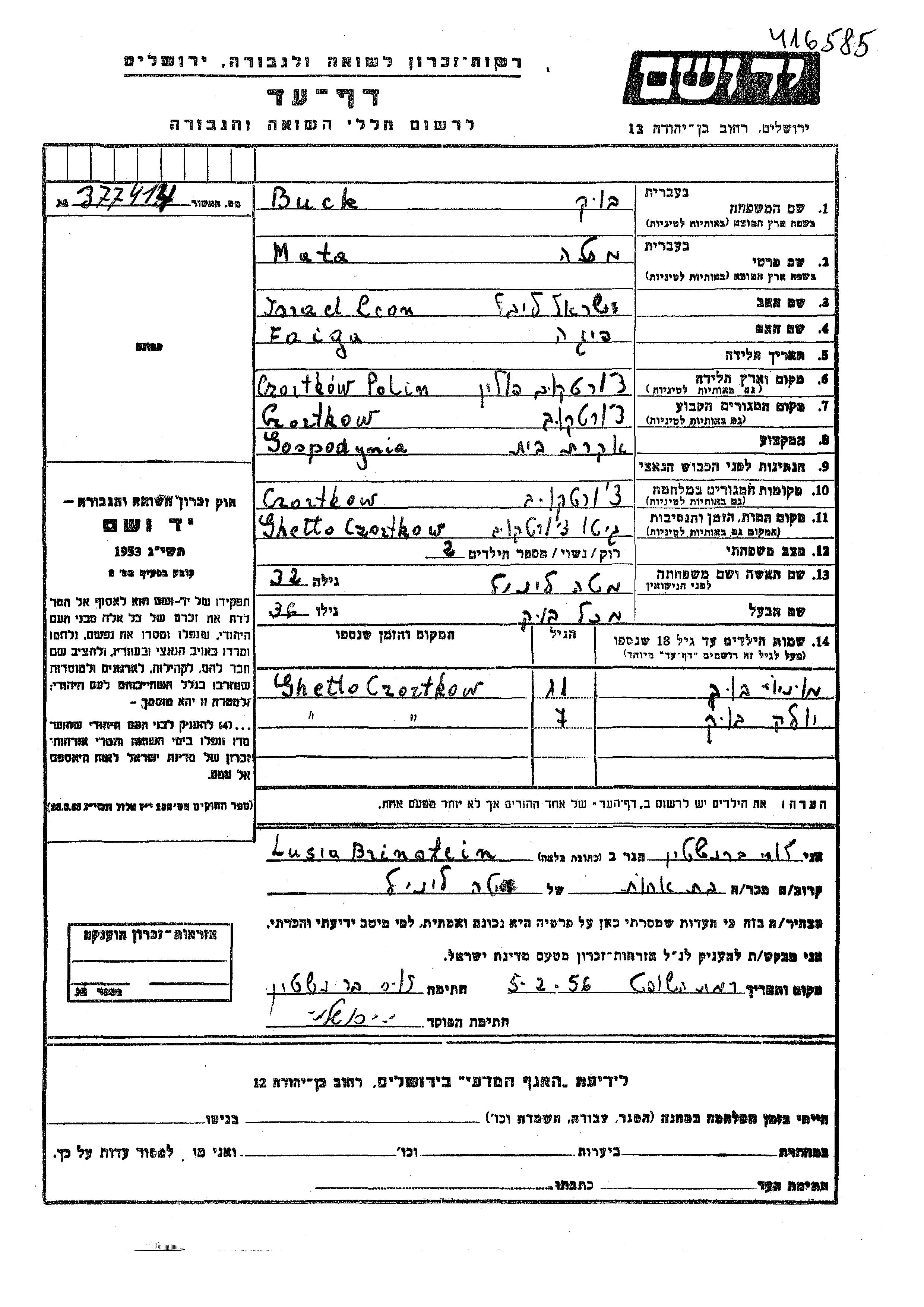 Mata Buck nee Lilial was born in Czortkow, Poland to Israel Leibel Leon and Faiga. She was a housewife and married to Mekhel. Prior to WWII she lived in Czortkow, Poland. During the war she was in Czortkow, Poland.