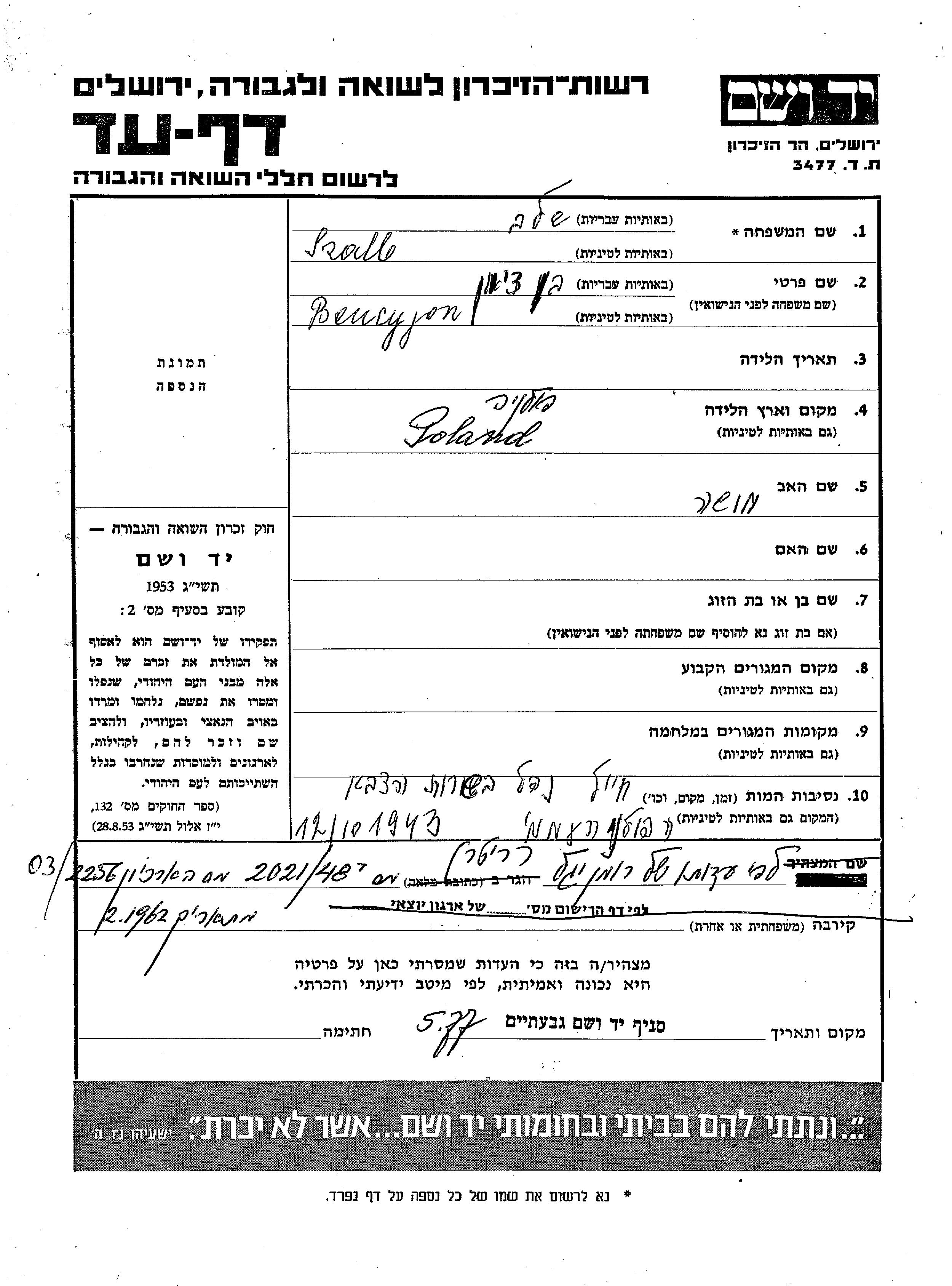 Szalb Bencyjon unstated place, Page of Testimony