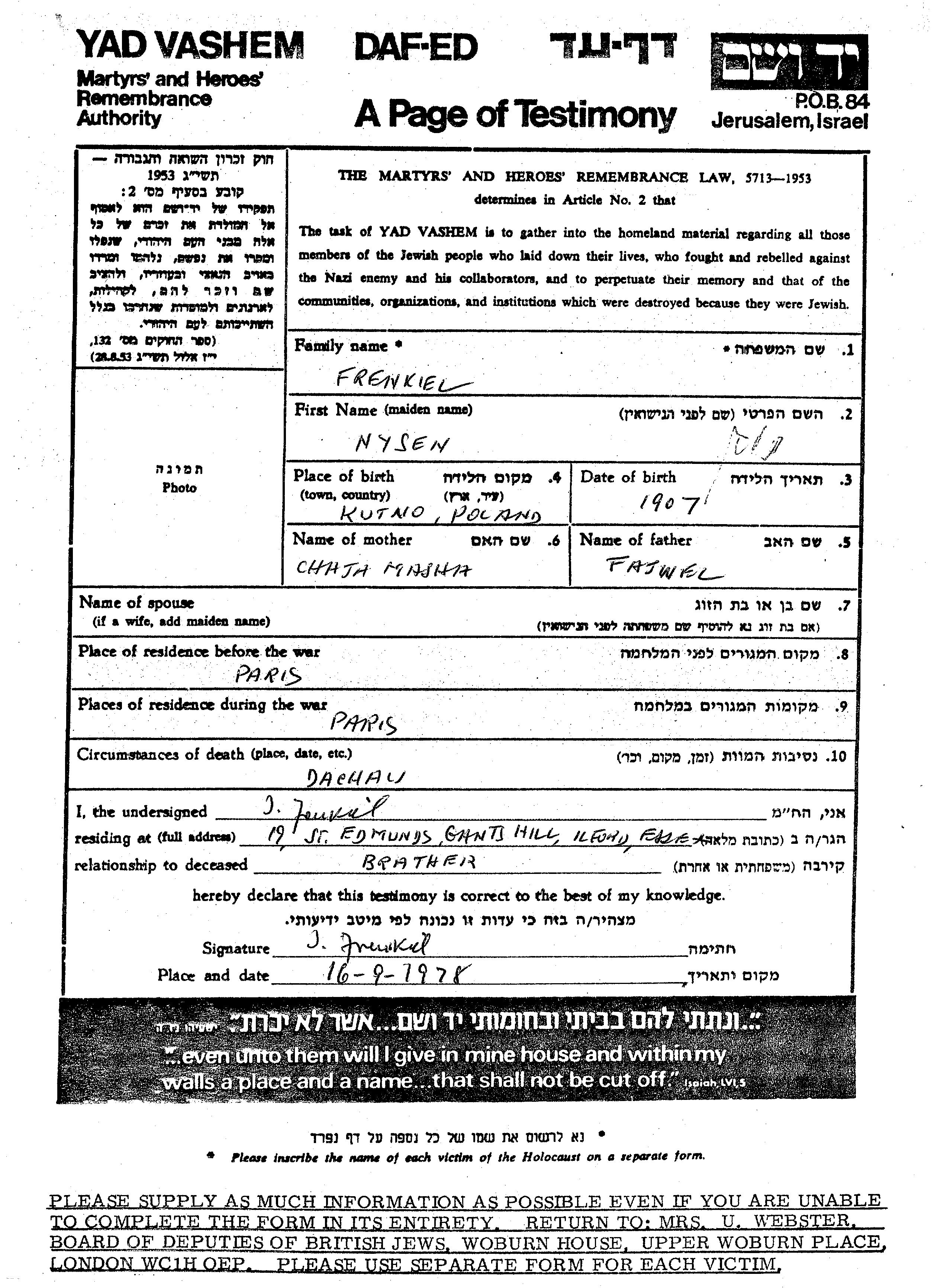 Frenkiel Nisen 1907 Paris, France Page of Testimony