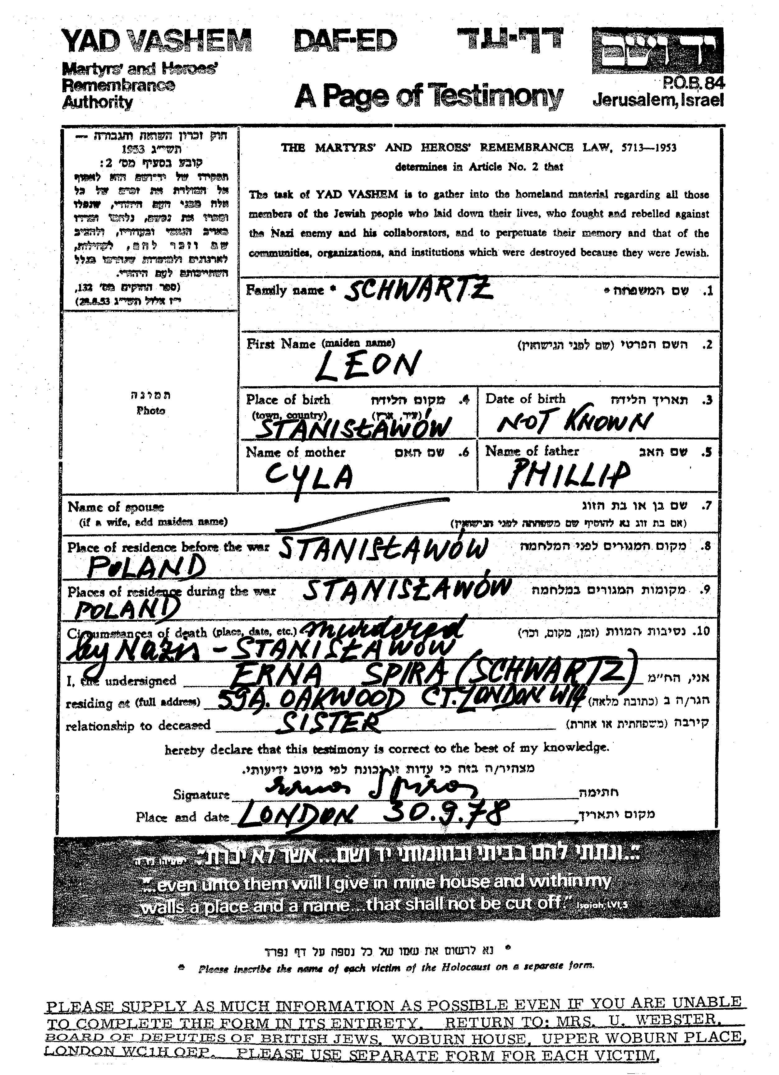 Schwartz Leon Stanislawow, Poland Page of Testimony