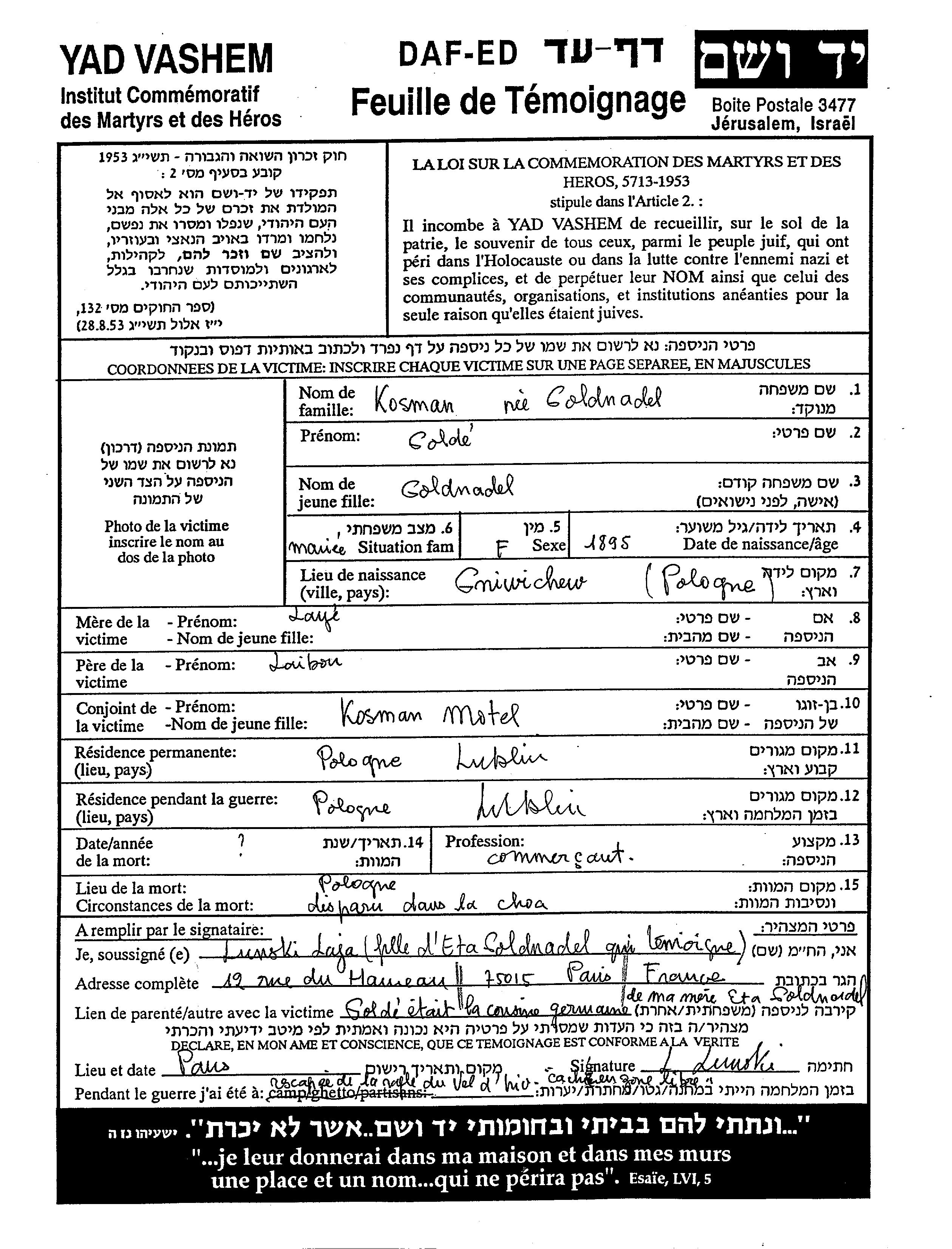 Golda Kosman nee Goldnadel was born in Gniewkowo, Poland, 1895 to Loibou and Laye. She was married to Motel. Prior to WWII she lived in Lublin, Poland. During the war she was in Lublin, Poland. Golda was murdered in the Shoah. Place of death: Lublin, Poland.