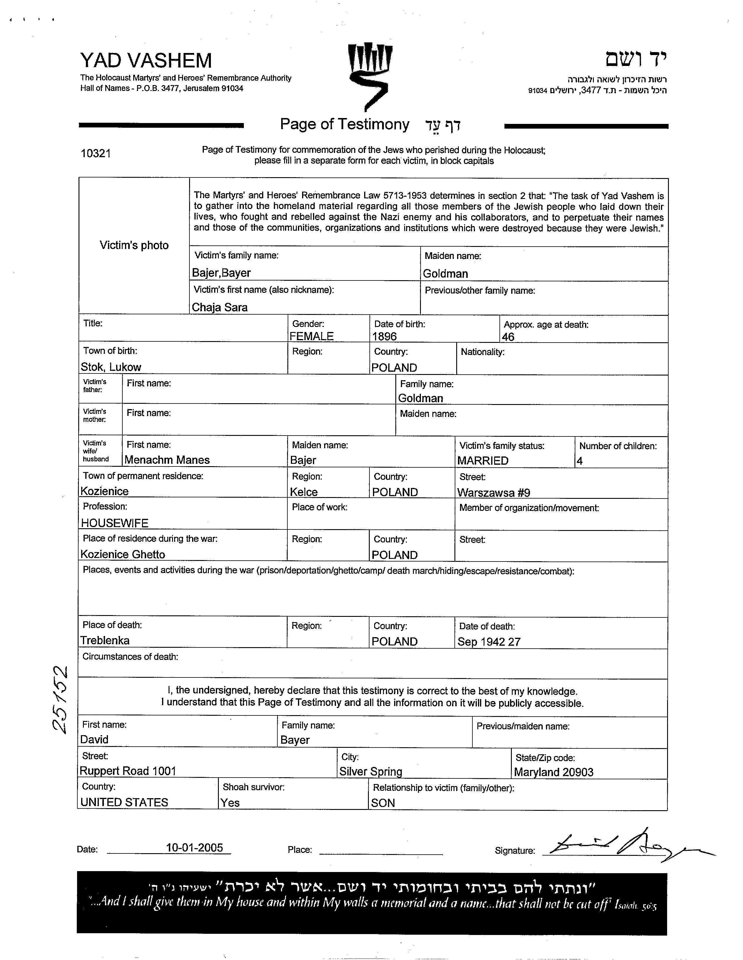 Bayer Sara Chaja 1896 Kozienice, Poland Page of Testimony (digital signed)