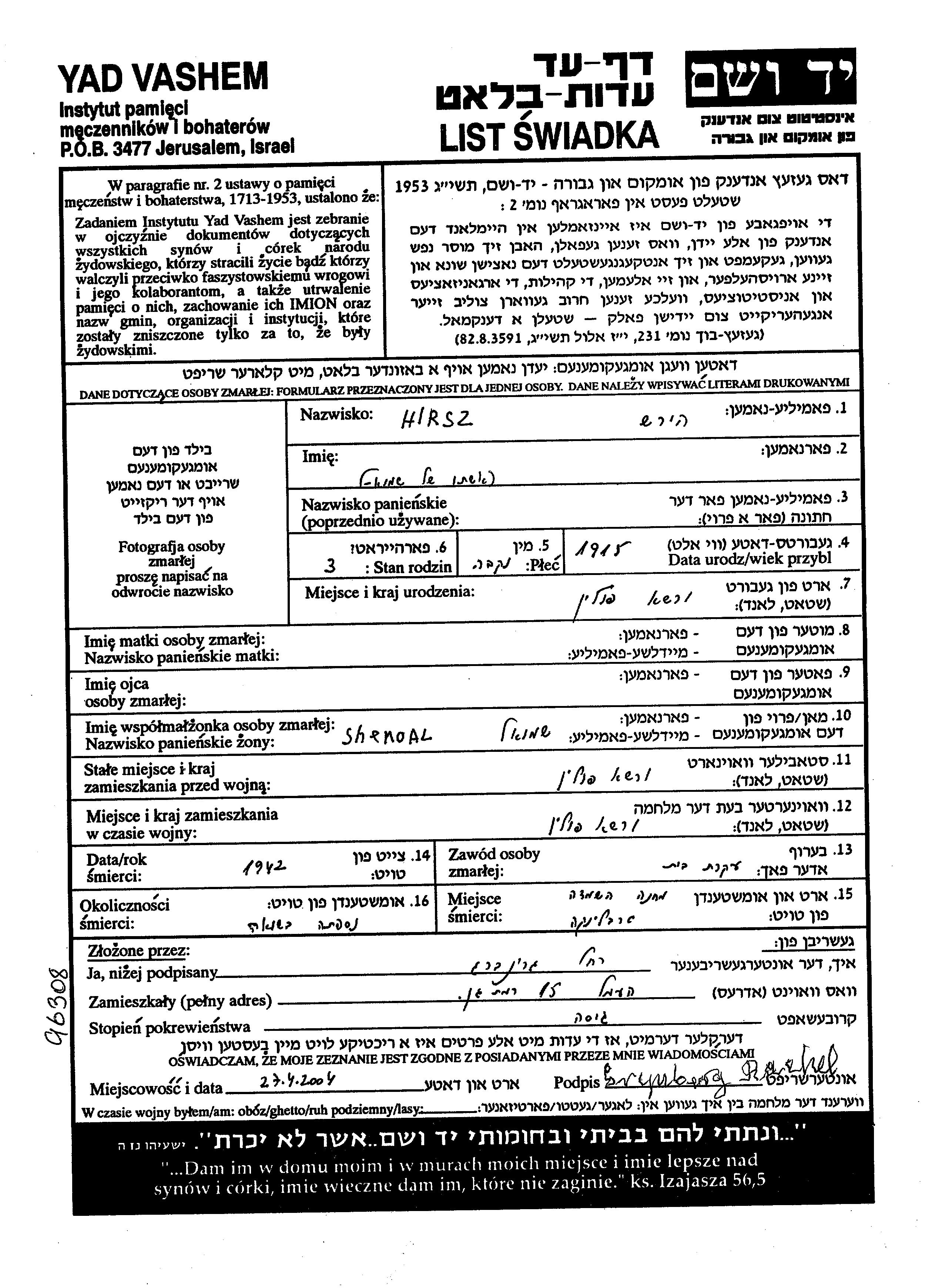 First name unknown Hirsz was born in Varsha, Poland, 1915. She was married to Shemoal. Prior to WWII she lived in Varsha, Poland. During the war she was in Varsha, Poland. She was murdered in the Shoah. Place of death: Treblinka, Poland, 1942.