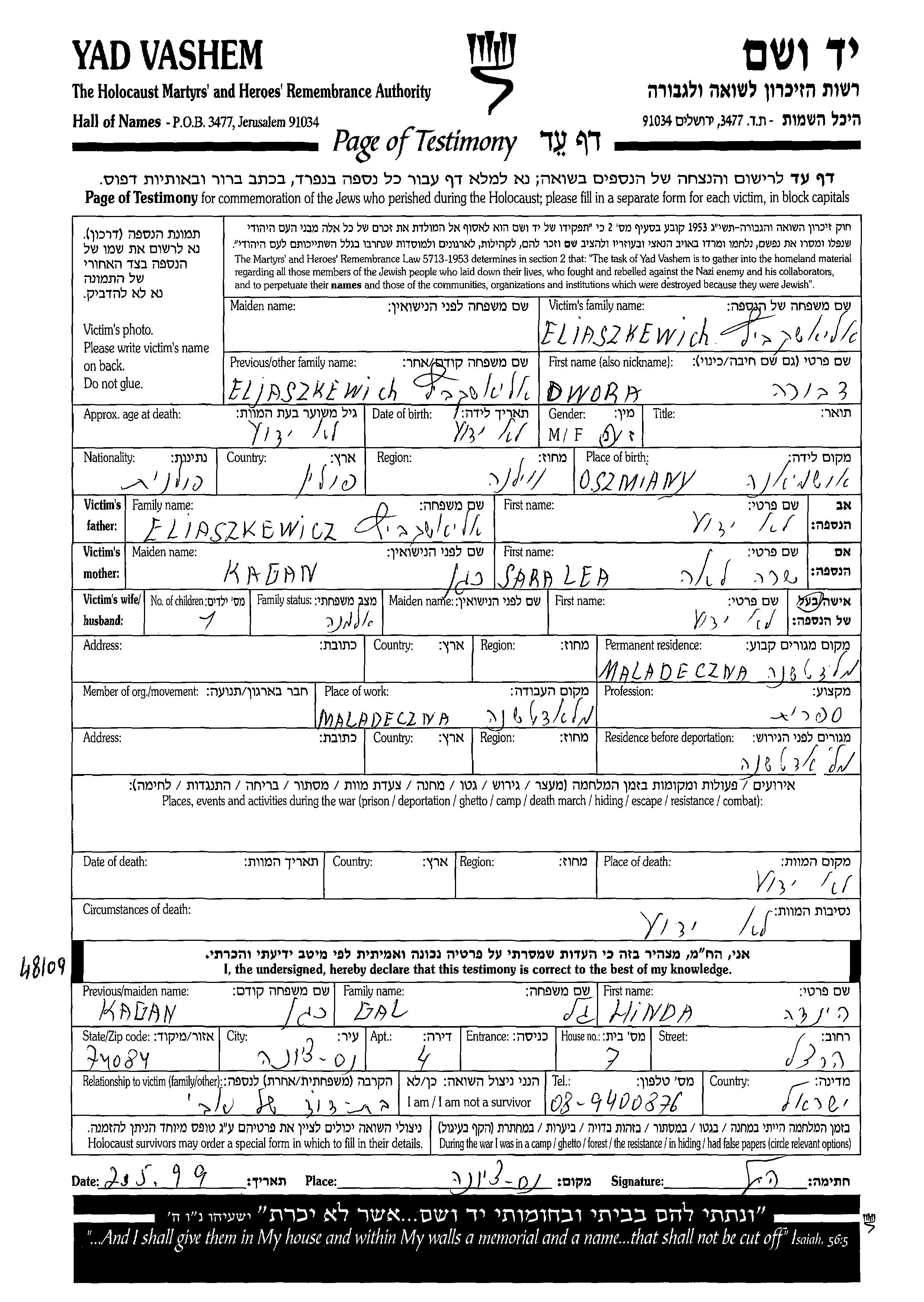 Dvora Eliaszkewich was born in Oszmiany, Poland to Sara Lea. She was a widowed. Prior to WWII she lived in Maladzechna, Poland. During the war she was in Maladzechna, Poland. Dvora was murdered in the Shoah.