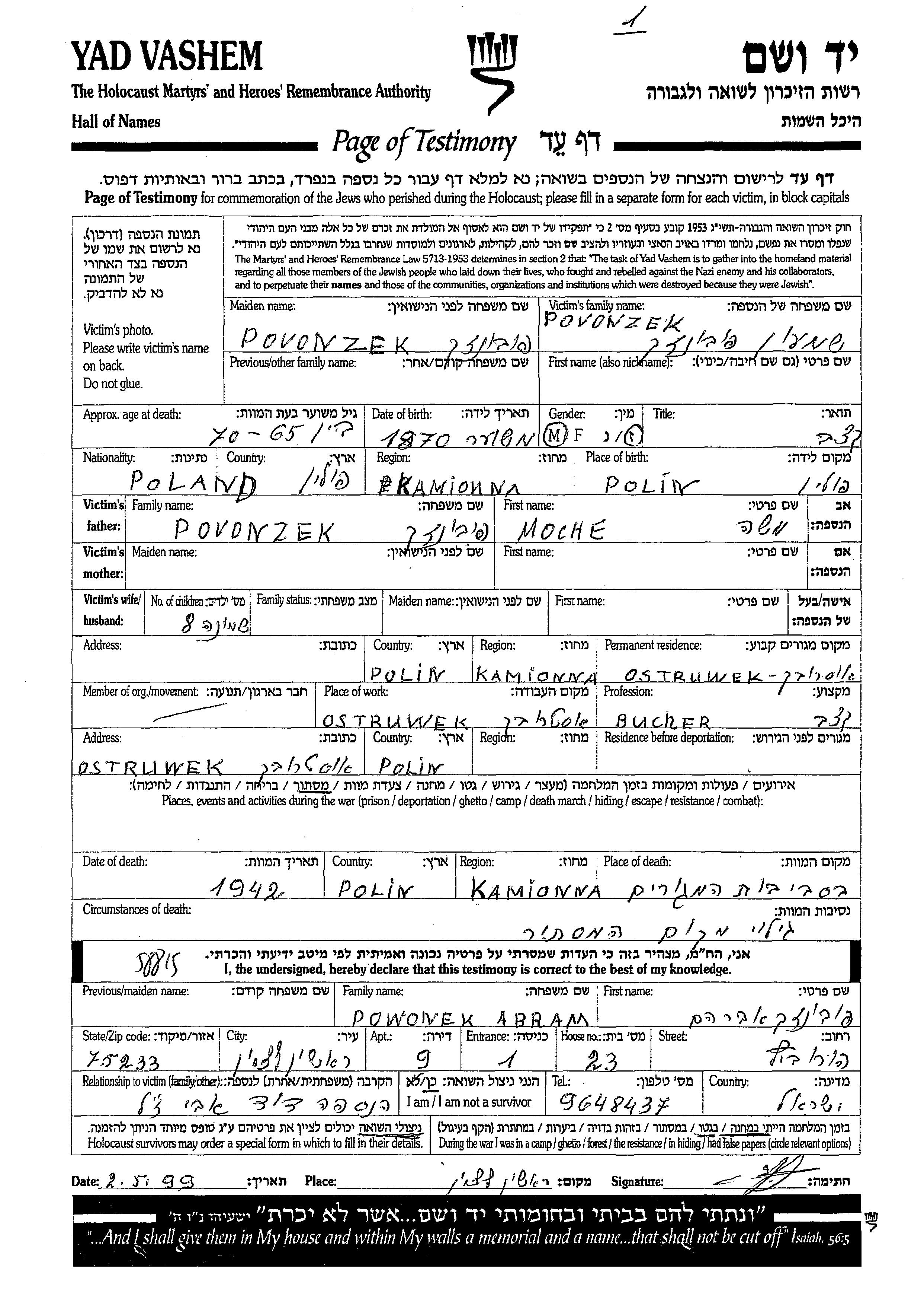 Povonzek Shimon 1870 Ostrówek, Poland Page of Testimony