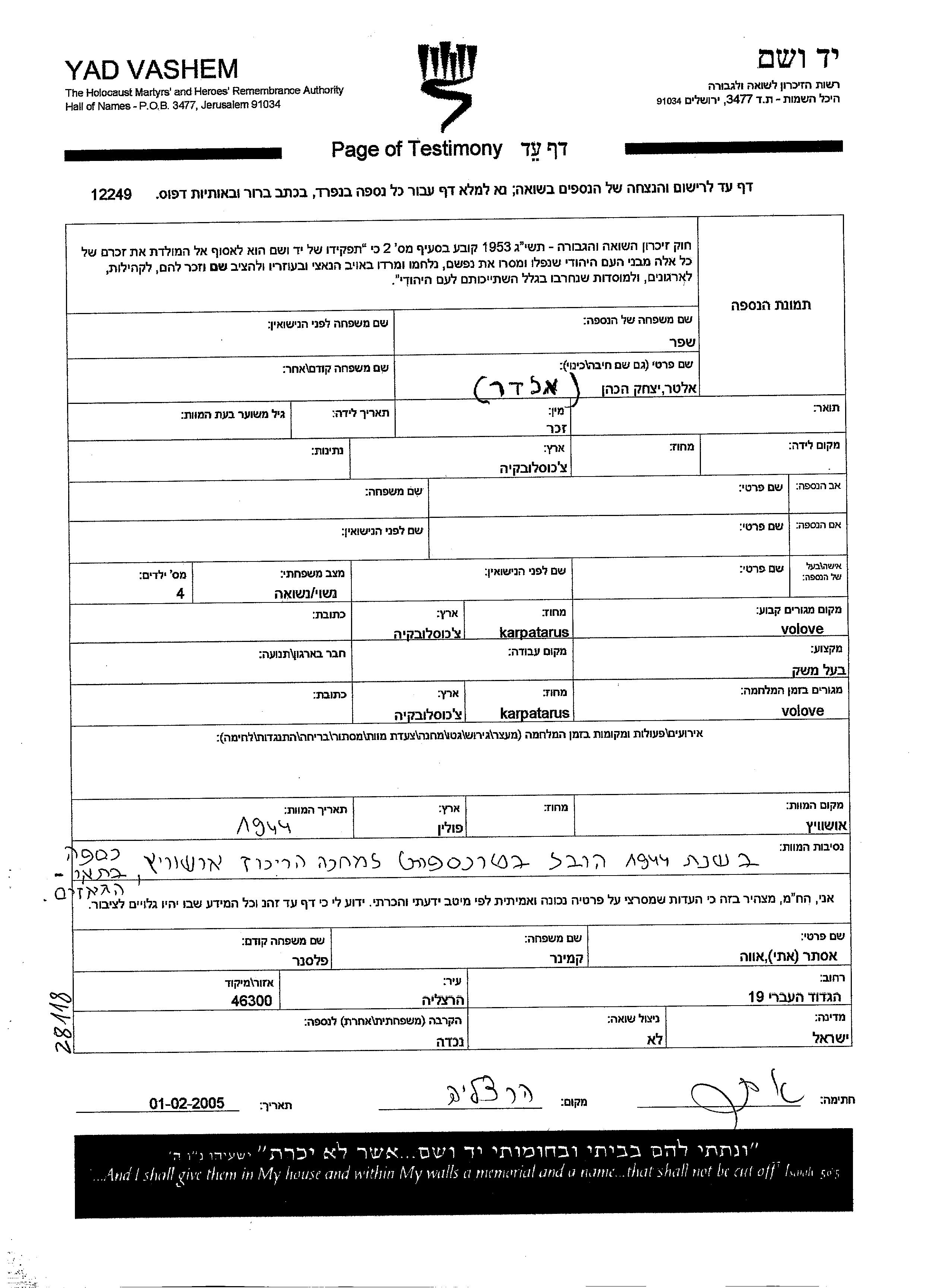 Shefer Hacohen Alter Yitzkhak Volove, Czechoslovakia Page of Testimony (digital signed)