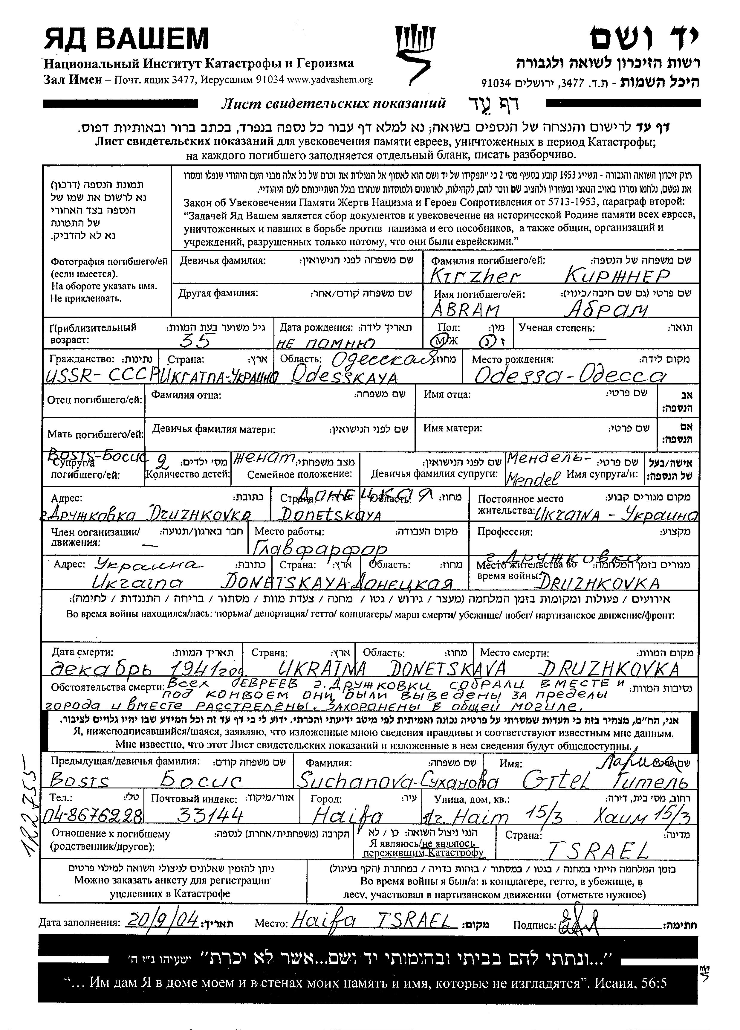 Abram Kirzhner was born in Odessa, Ukraine (USSR). He was married to Mendel nee Bosis. Prior to WWII he lived in Druzhkovka, Ukraine (USSR). During the war he was in Druzhkovka, Ukraine (USSR). Abram was murdered in the Shoah. Place of death: Druzhkovka, Ukraine (USSR), 12/1941.