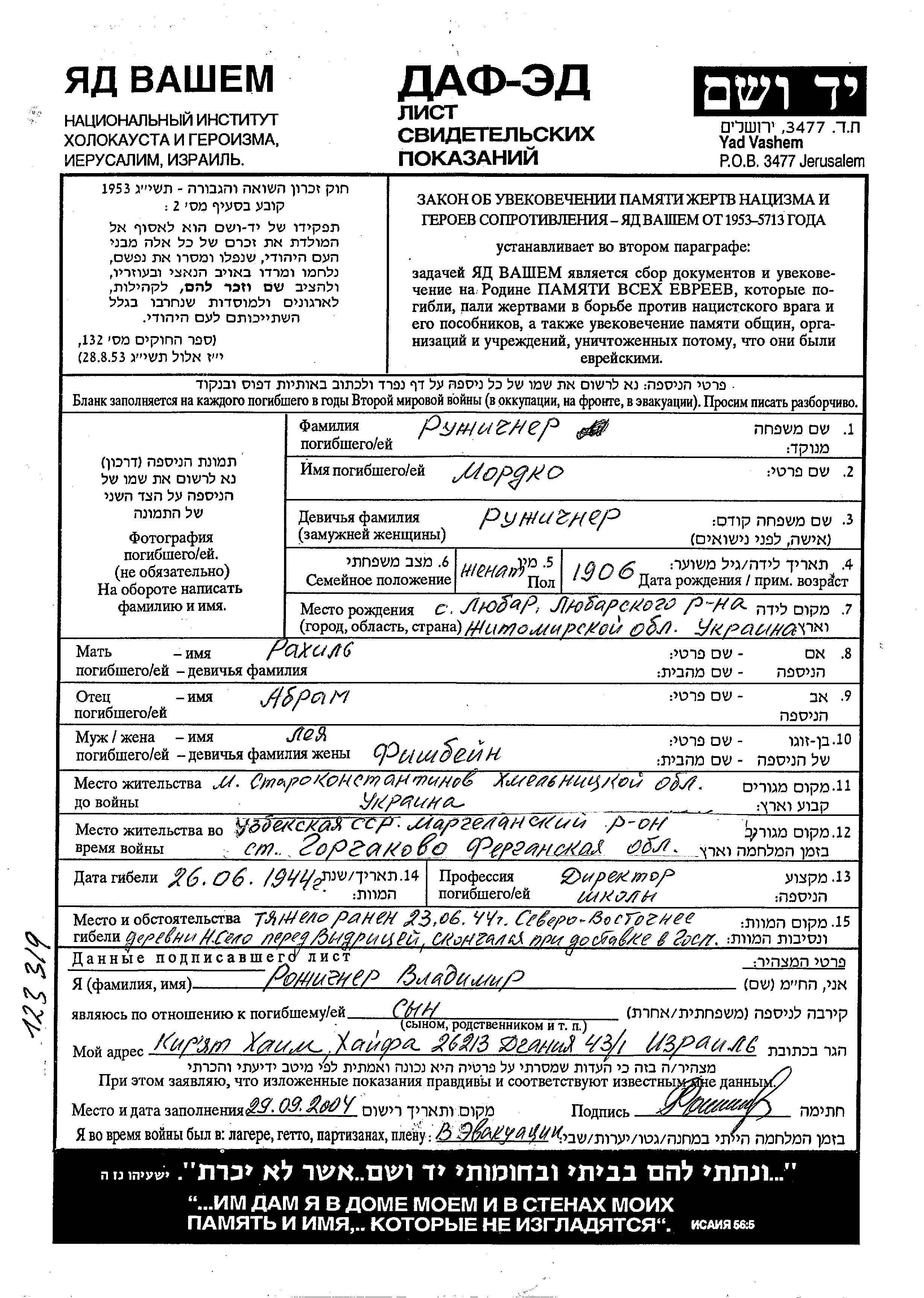 Mordko Ruzhichner was born in Lyubar, Ukraine (USSR), 1906 to Abram and Rakhil. He was married to Lea nee Fishbein. Prior to WWII he lived in Starokonstantinov, Ukraine (USSR). During the war he was in Starokonstantinov, Ukraine (USSR). Mordko was killed in military service in WWII. Place of death: Novoye Selo, Belorussia (USSR), 26/06/1944.