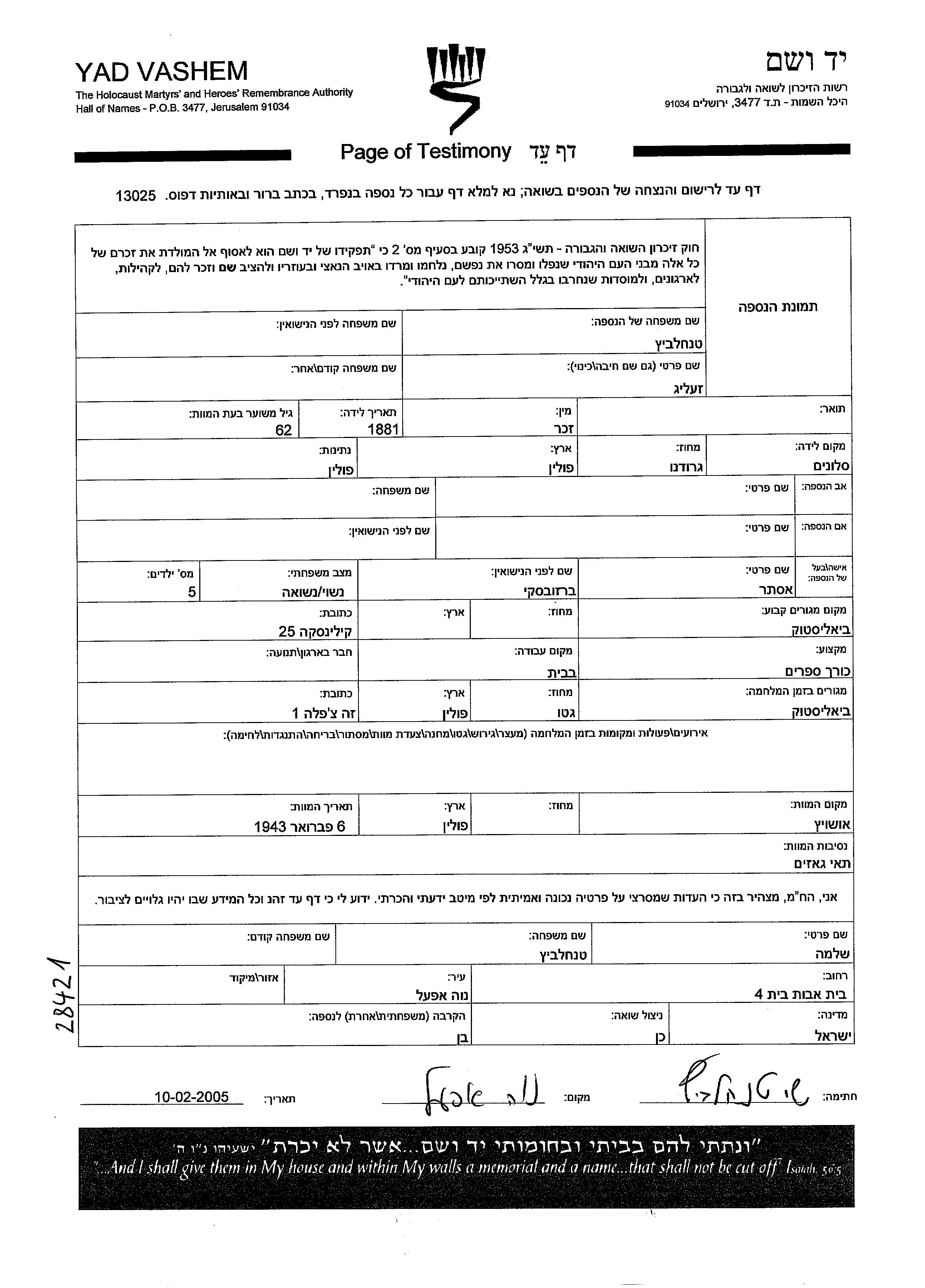 Zelig Tankhilevitz was born in Slonim, Poland, 1881. He was a bookbinder and married to Esther nee Brazovski. Prior to WWII he lived in Bialystok, Poland. During the war he was in Bialystok, Poland. Zelig was murdered in the Shoah. Place of death: Auschwitz, Poland, 06/02/1943.