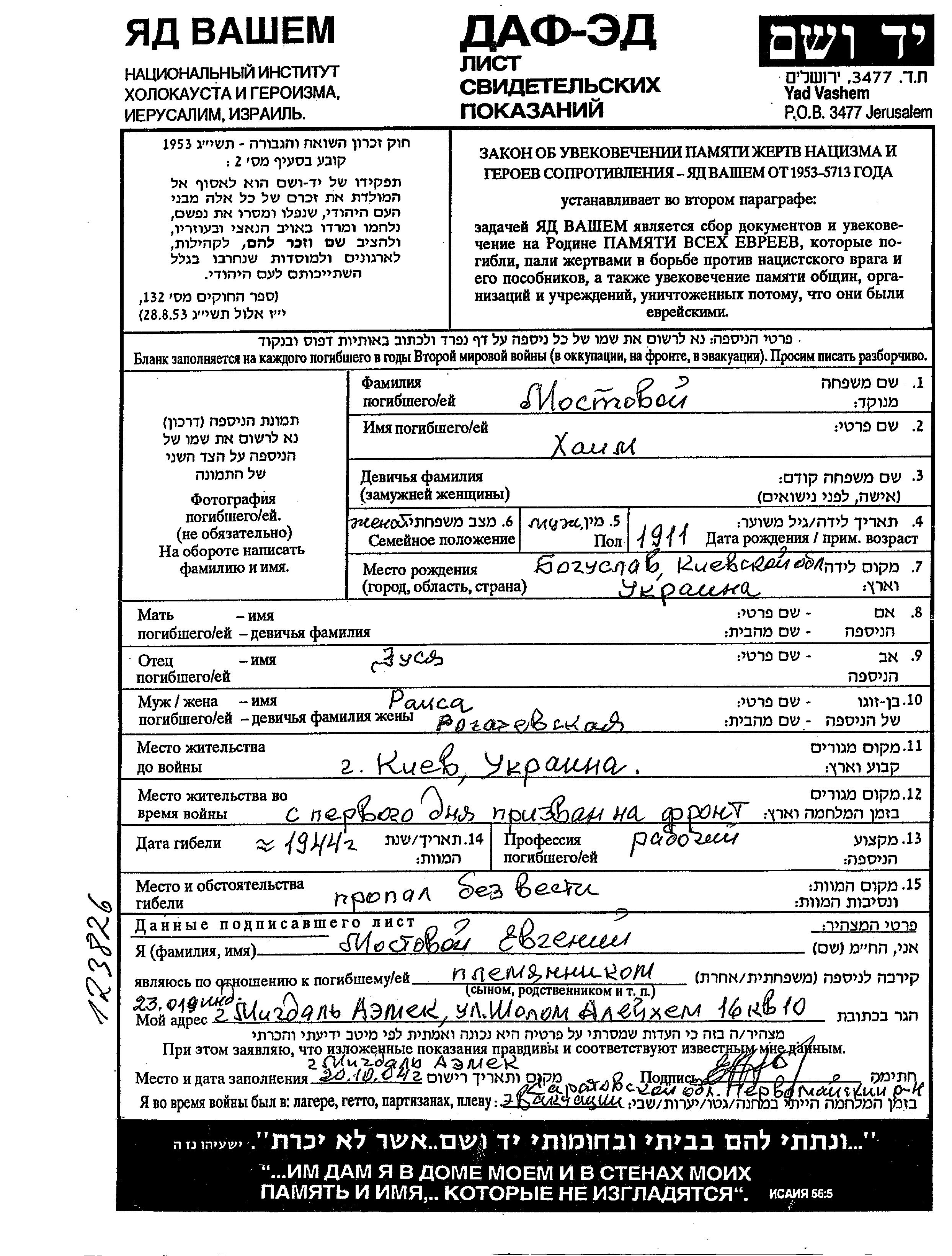 Mostovoi Khaim 1911 Kiev, Ukraine (USSR) Page of Testimony