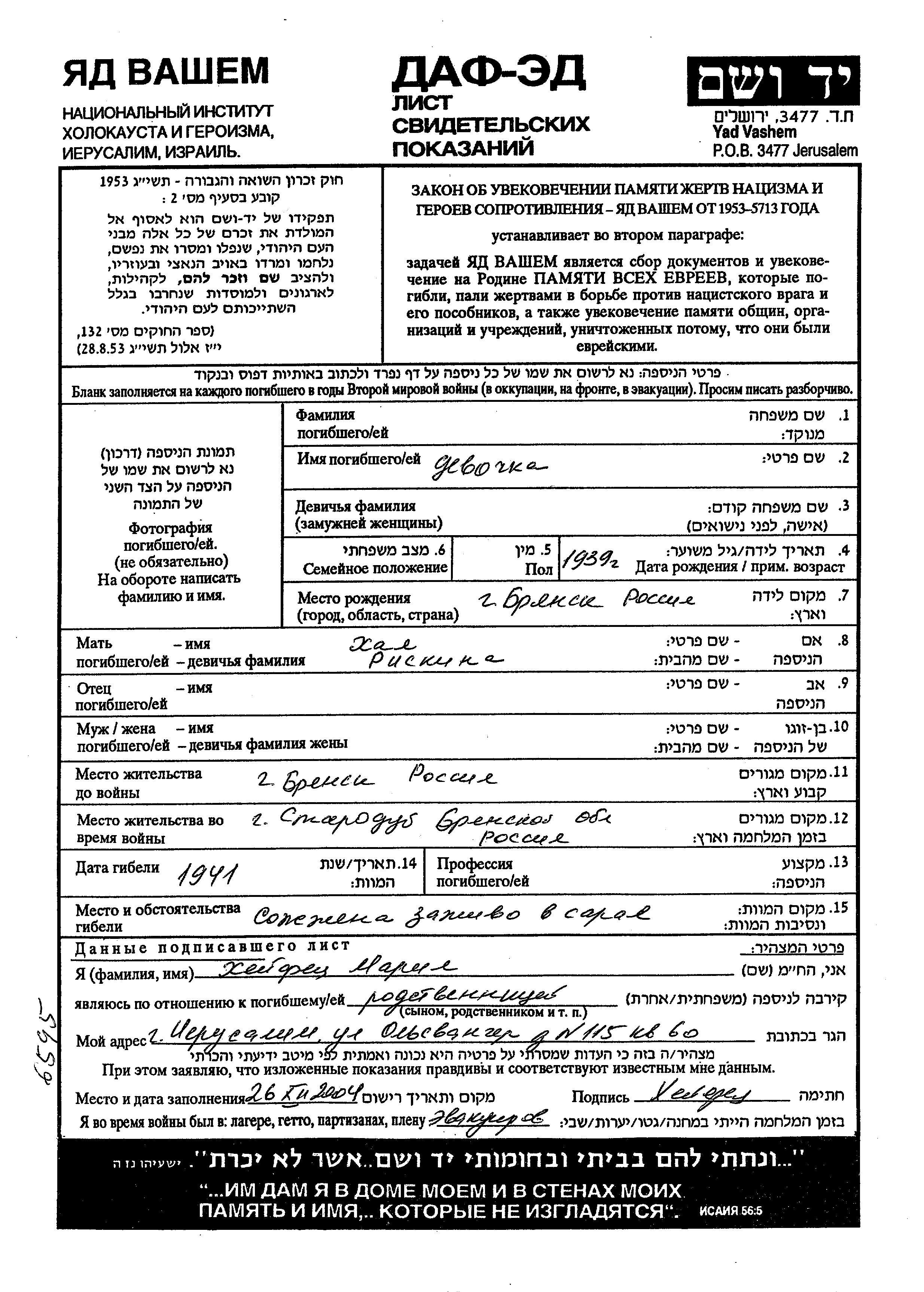Surname unknown First name unknown 1939 Bryansk, Russia (USSR) Page of Testimony