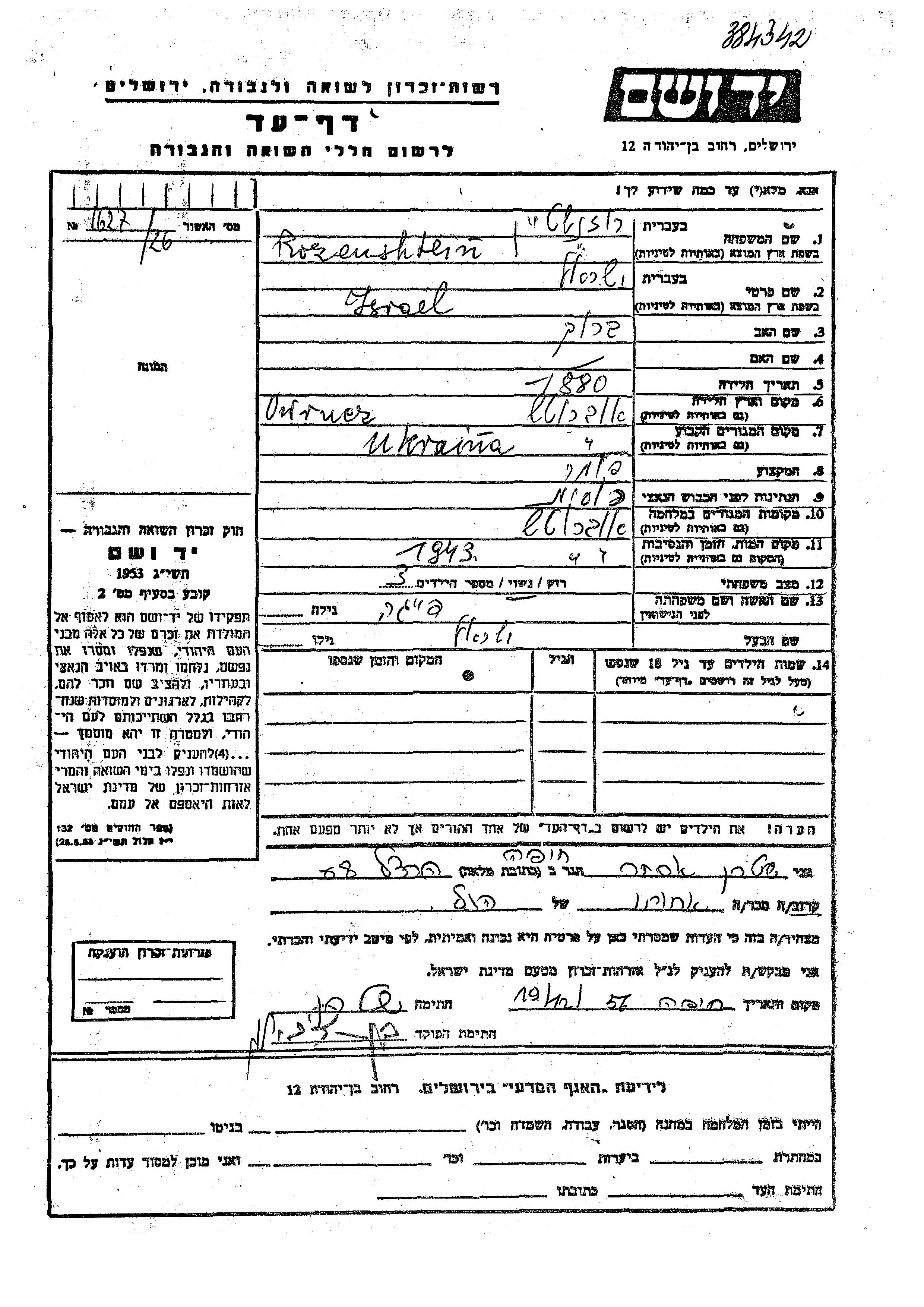 Rozenshtein Ysrael 1880 Owrucz, Ukraine (USSR) Page of Testimony