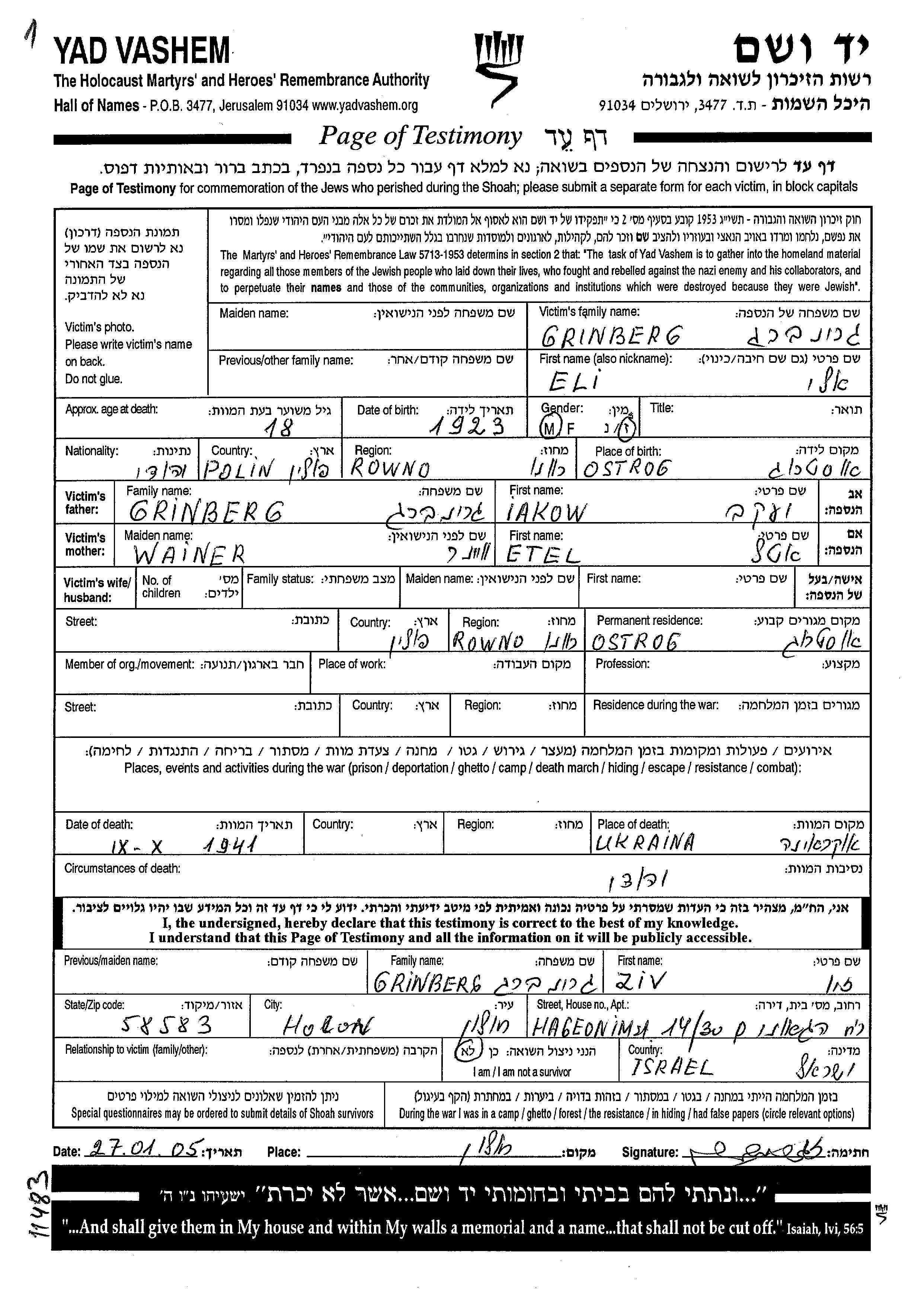 Eli Grinberg was born in Ostrog, Poland, 1923 to Iakow and Etel nee Wainer. He was single. Prior to WWII he lived in Ostrog, Poland. During the war he was in Ostrog, Poland.