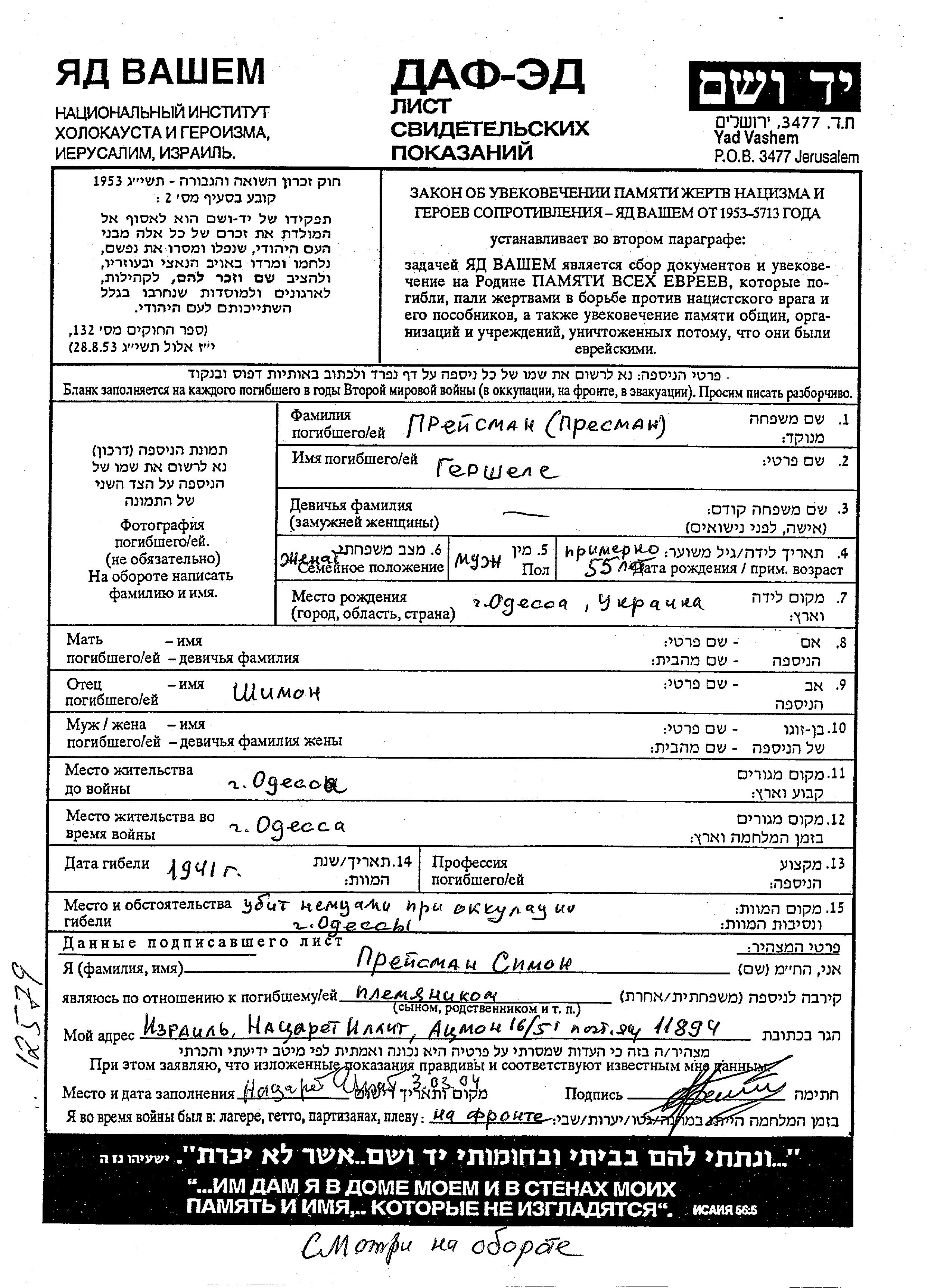 Preisman Presman Gershele Odessa, Ukraine (USSR) Page of Testimony