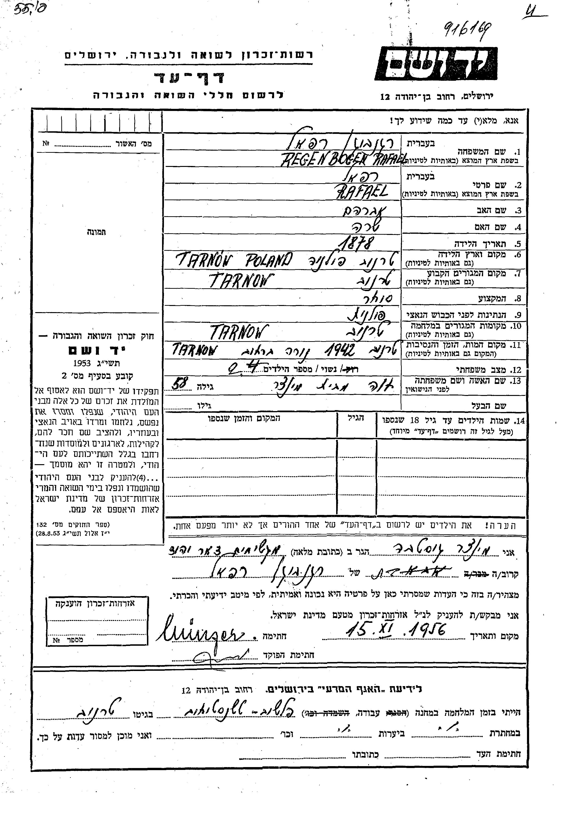 Regenbogen Rafael 1878 Tarnow, Poland Page of Testimony