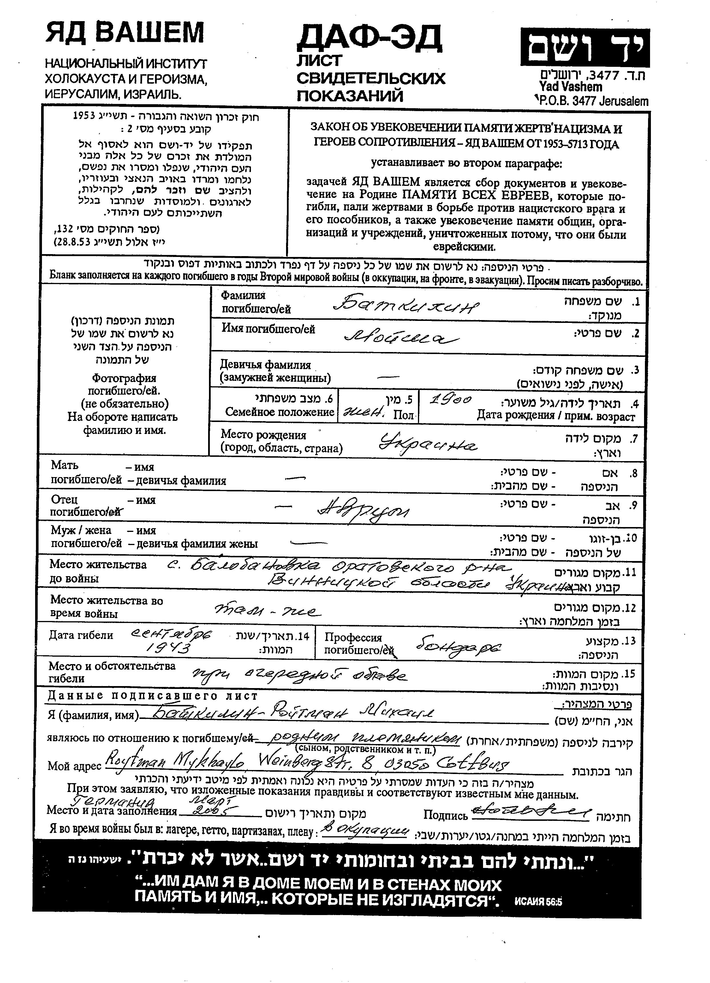 Batkilin Moisha 1900 Balabanovka, Ukraine (USSR) Page of Testimony