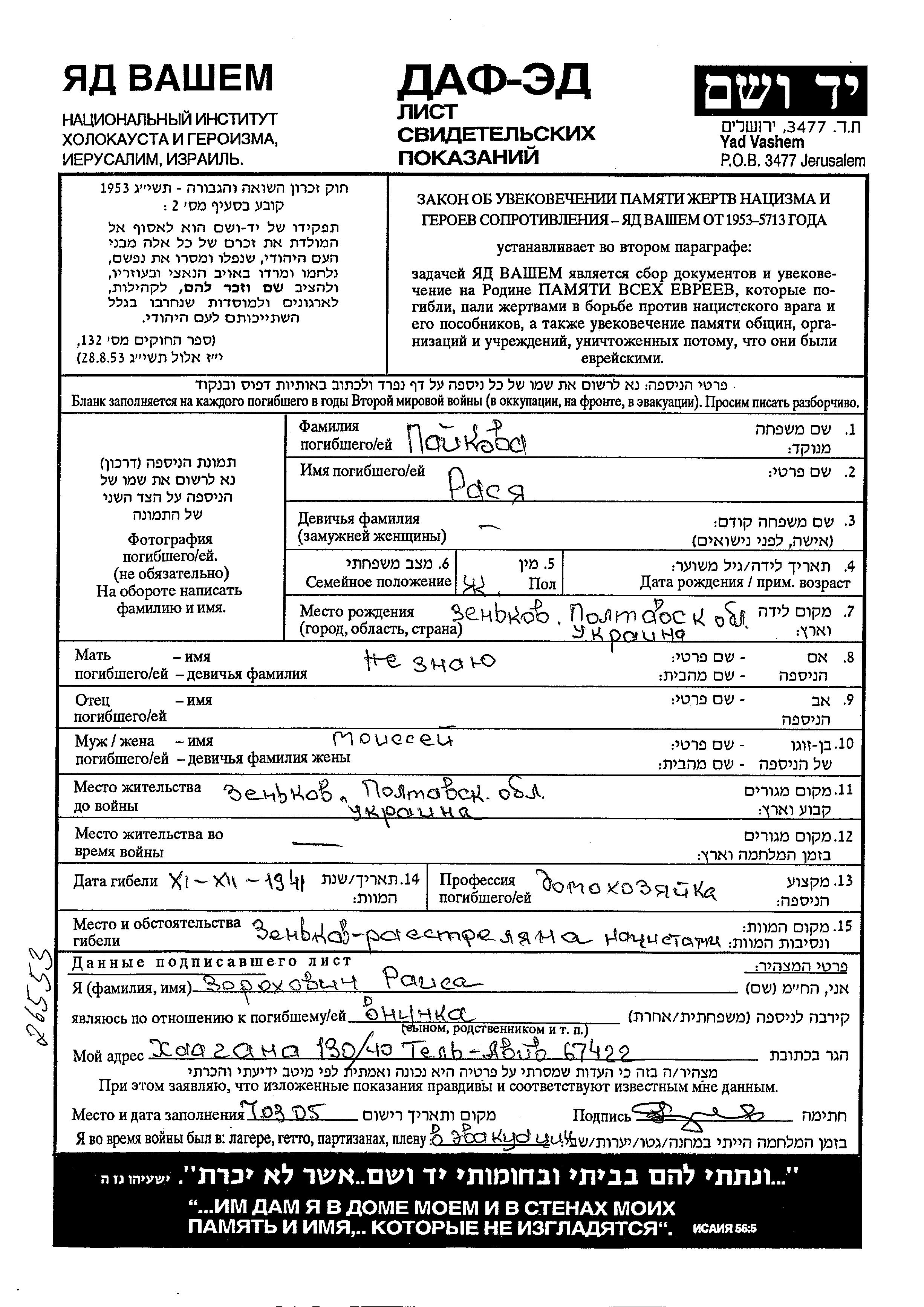 Rasya Paikova was born in Zenkov, Ukraine (USSR). Prior to WWII she lived in Zenkov, Ukraine (USSR). During the war she was in Zenkov, Ukraine (USSR). Rasya was murdered in the Shoah. Place of death: Zenkov, Ukraine (USSR), 11/12/1941.