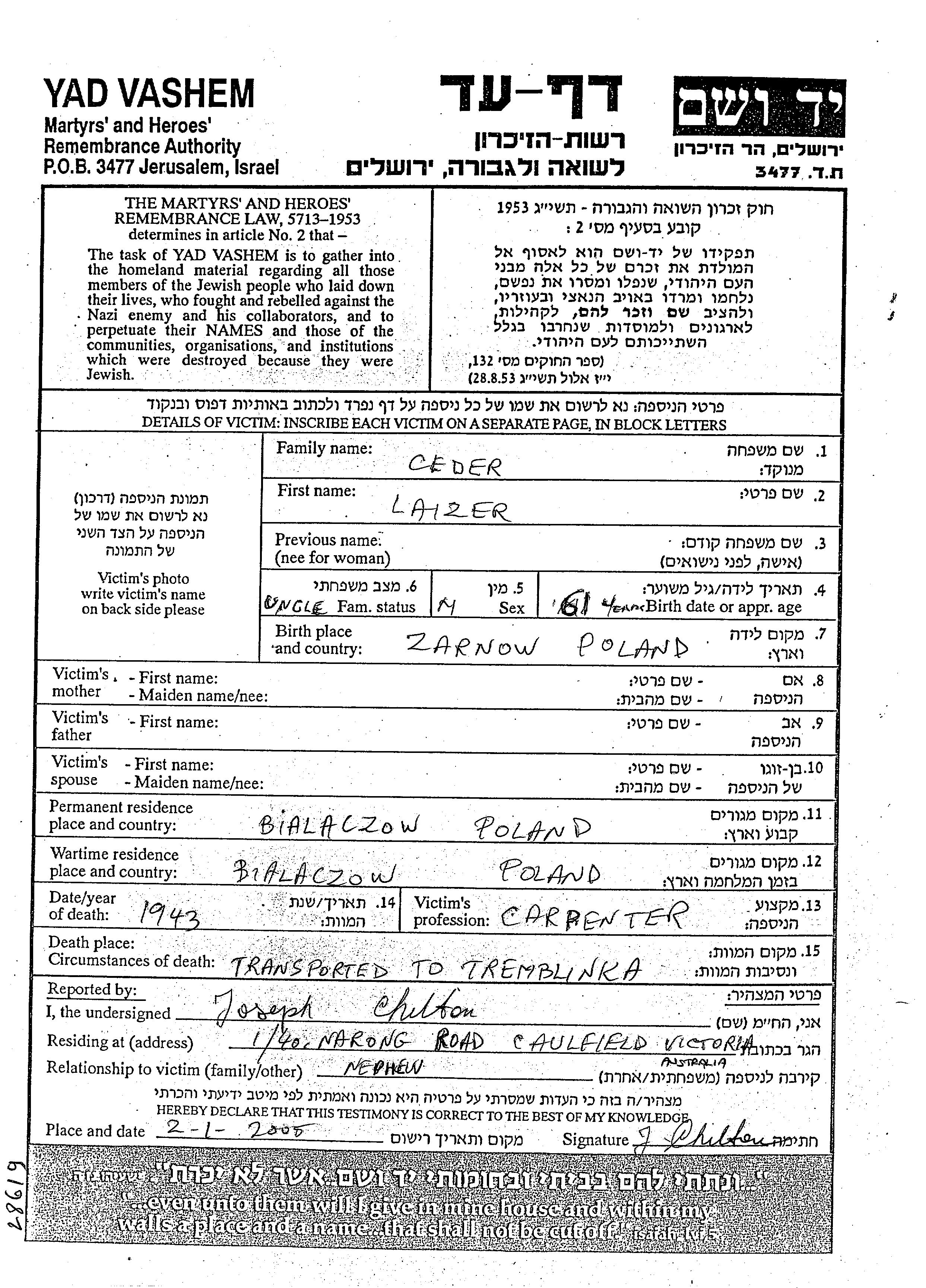 Lazer Ceder was born in Zarnow, Poland. Prior to WWII he lived in Bialaczow, Poland. During the war he was in Bialaczow, Poland. Lazer was murdered in the Shoah. Place of death: Treblinka, Poland, 1943.