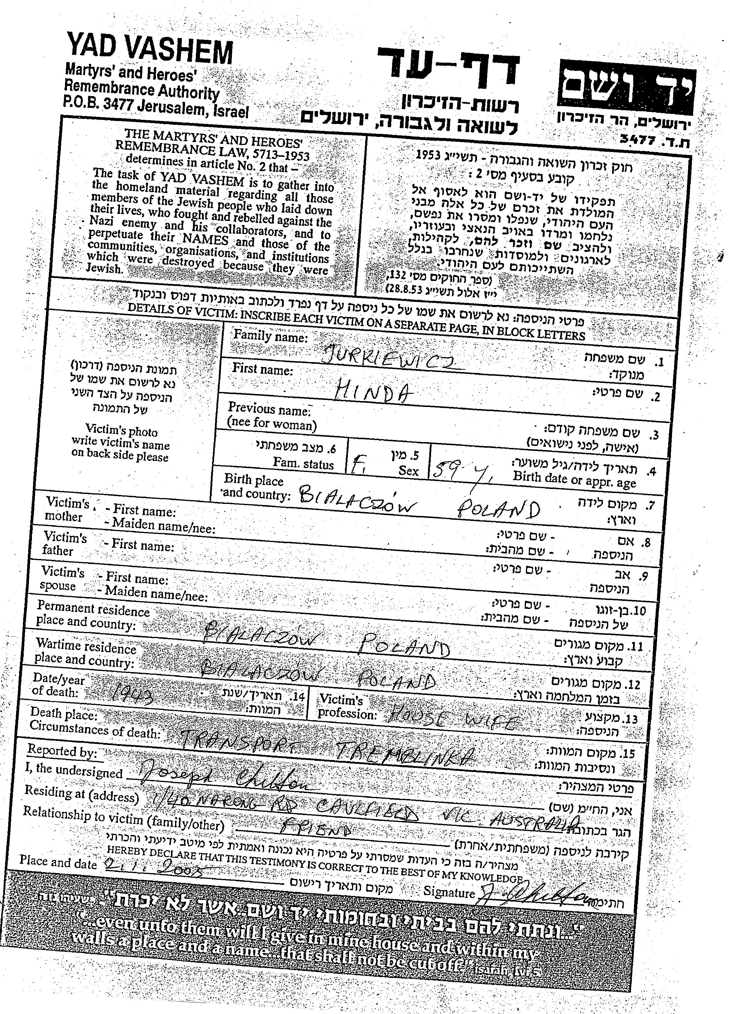 Hinda Jurkiewicz was born in Bialaczow, Poland. Prior to WWII she lived in Bialaczow, Poland. During the war she was in Bialaczow, Poland. Hinda was murdered in the Shoah. Place of death: Treblinka, Poland, 1943.