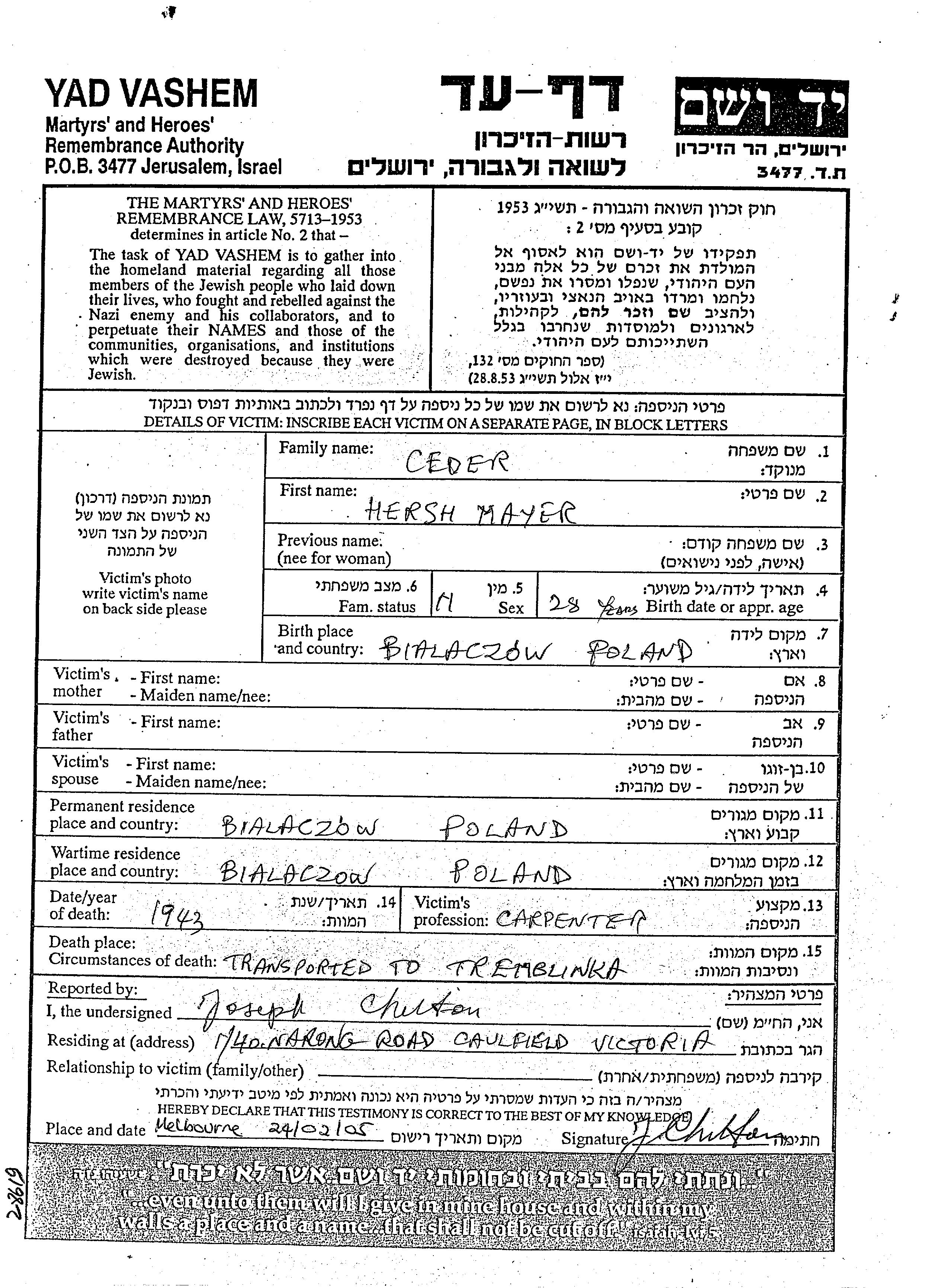 Hersh Mayer Ceder was born in Bialaczow, Poland. Prior to WWII he lived in Bialaczow, Poland. During the war he was in Bialaczow, Poland. Hersh Mayer was murdered in the Shoah. Place of death: Treblinka, Poland, 1943.