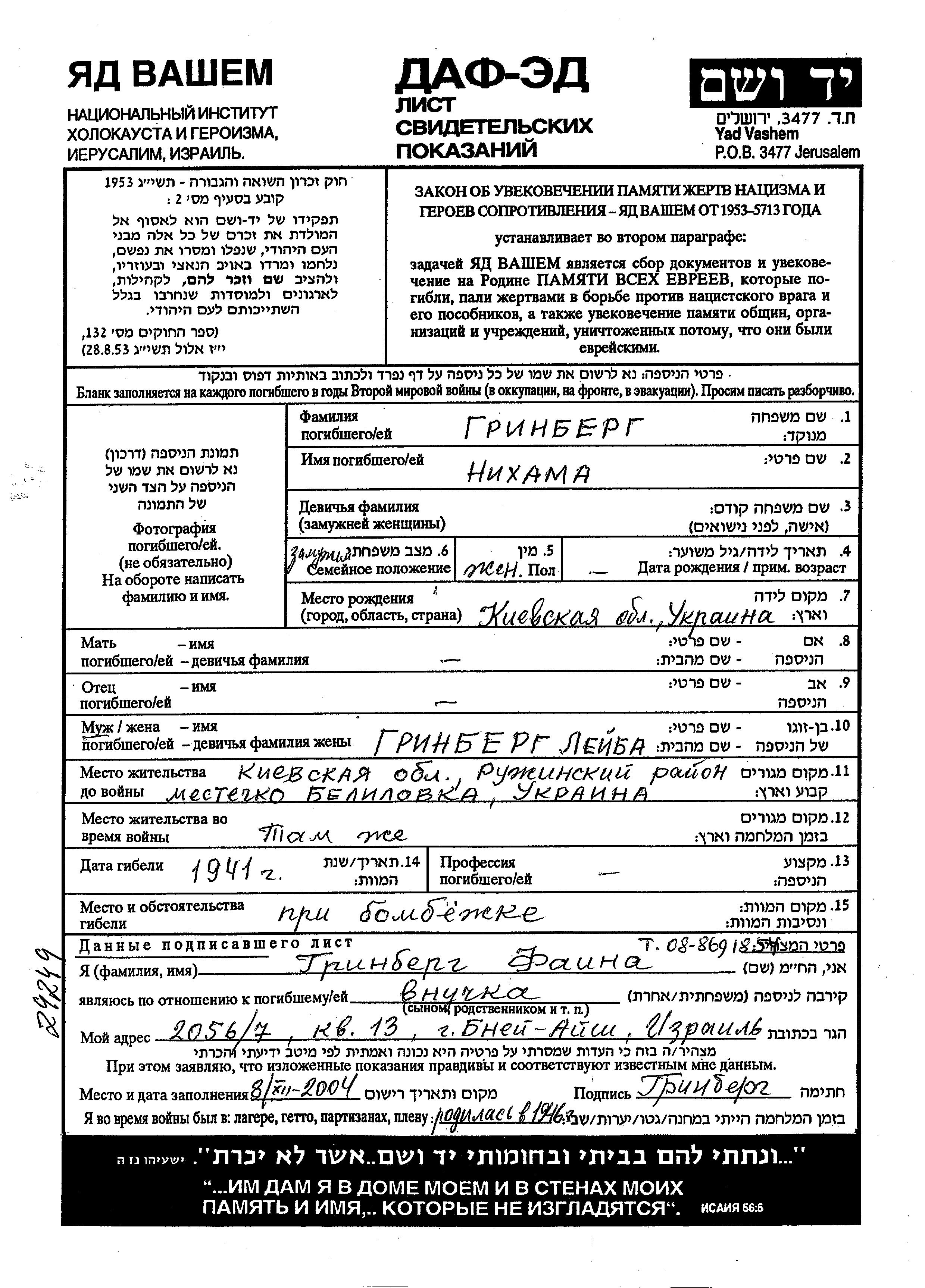 Grinberg Nikhama Belilovka, Ukraine (USSR) Page of Testimony