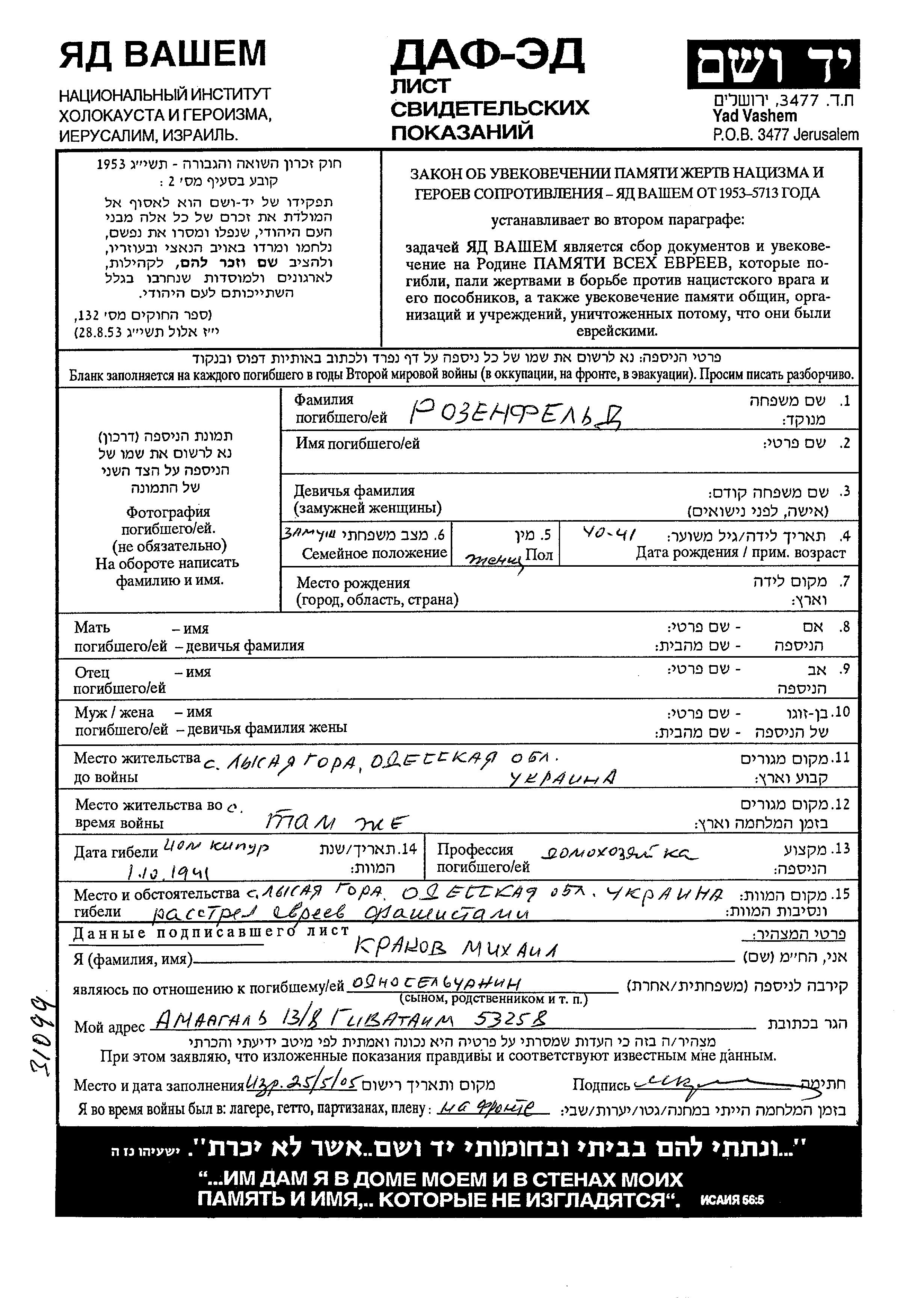 Yad Vashem - Pages of Testimony Names Memorial Collection