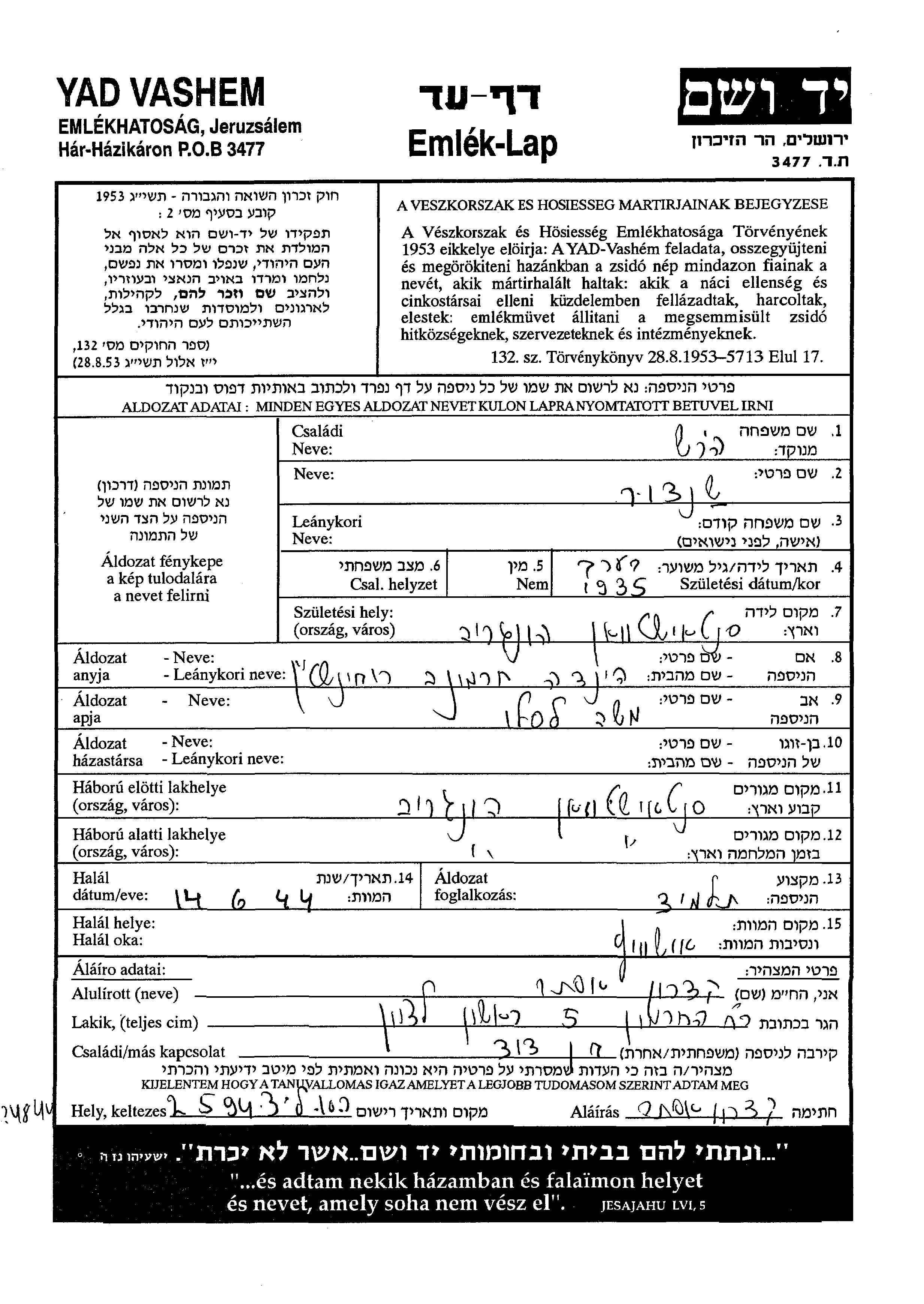 Hirsh Sandor 1935 Szentistvan, Hungary Page of Testimony