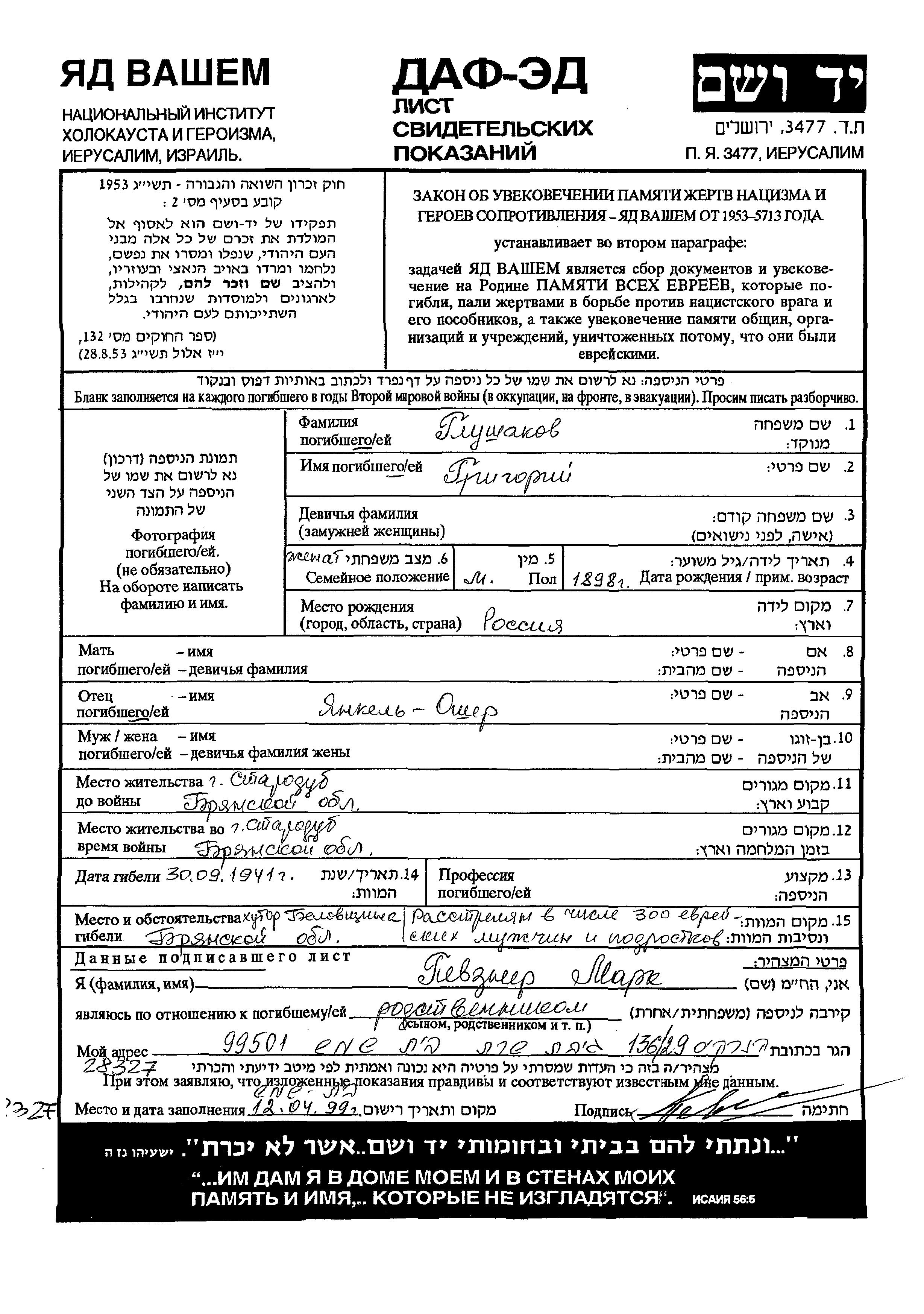 Grigori Glushakov was born in Russia (USSR), 1898 to Osher Yankel. He was married. Prior to WWII he lived in Starodub, Russia (USSR). During the war he was in Starodub, Russia (USSR).