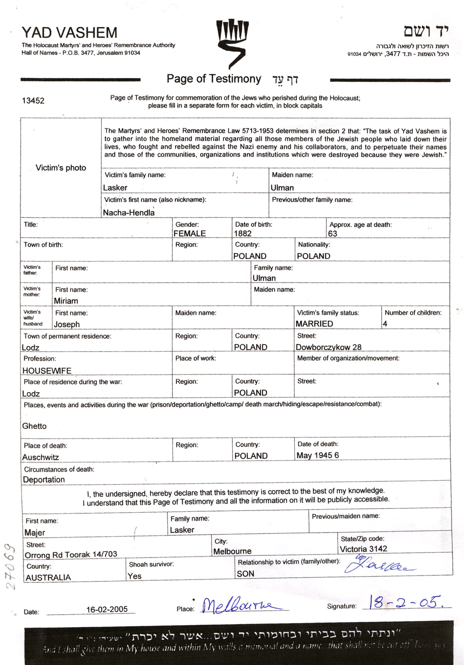 Nacha Hendla Lasker nee Ulman was born in Poland, 1882 to Miriam. She was married to Joseph. Prior to WWII she lived in Lodz, Poland. During the war she was in Ghetto. Nacha Hendla was murdered in the Shoah. Place of death: Auschwitz, Poland, 06/05/1945.