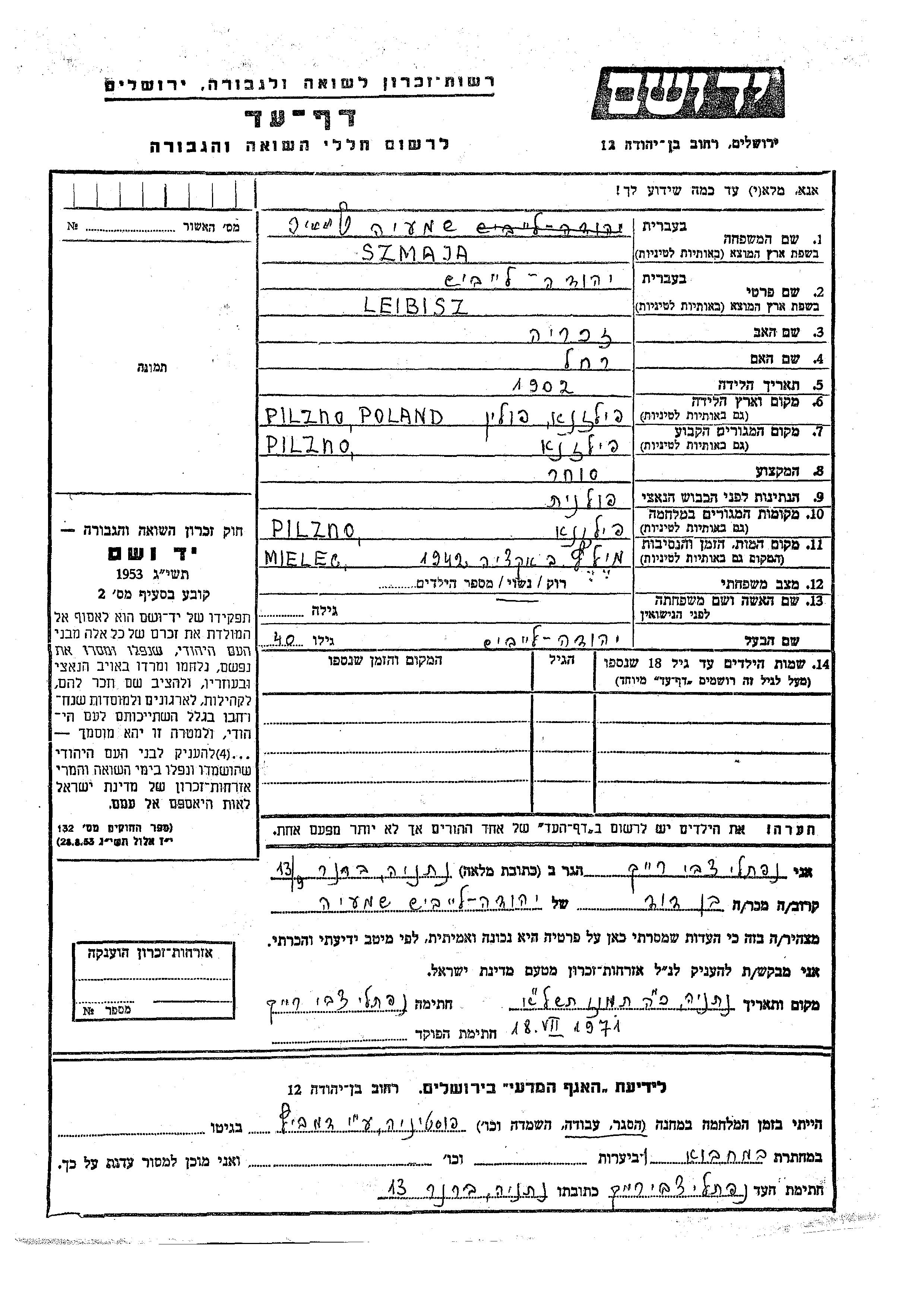 Leibisz Yehuda Szmaja was born in Pilzno, Poland, 1902 to Zakharia and Rakhel. He was a merchant and married. Prior to WWII he lived in Pilzno, Poland. During the war he was in Pilzno, Poland. Leibisz Yehuda was murdered in the Shoah. Place of death: Mielec, Poland, 1942.