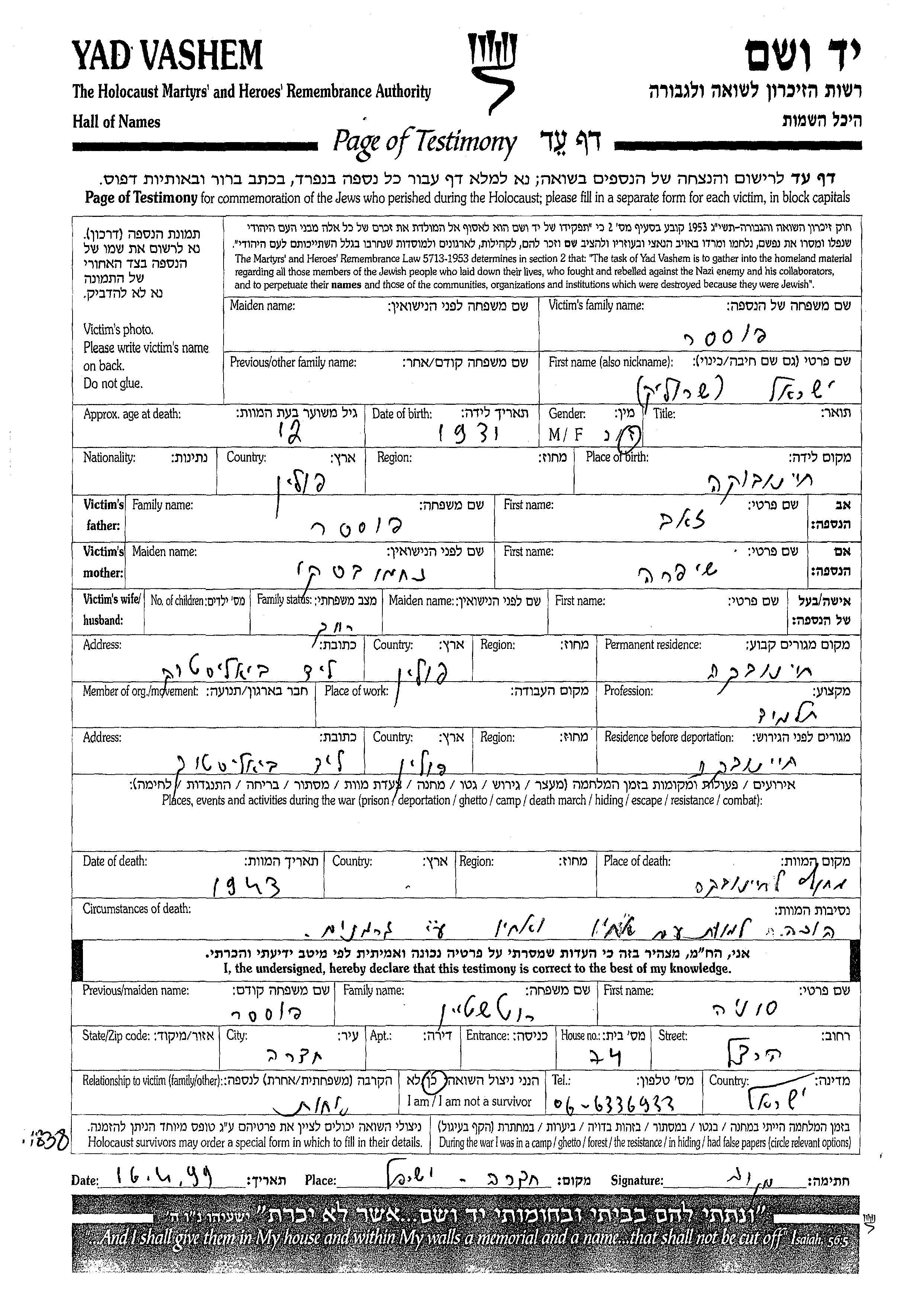 Yisrael Posser was born in Hajnówka, Poland, 1931 to Zeev and Shifra nee Nakhemovski. He was a pupil and child. Prior to WWII he lived in Hajnówka, Poland. During the war he was in Hajnówka, Poland. Yisrael was murdered in the Shoah. Place of death: Hajnówka, Poland, 1943.