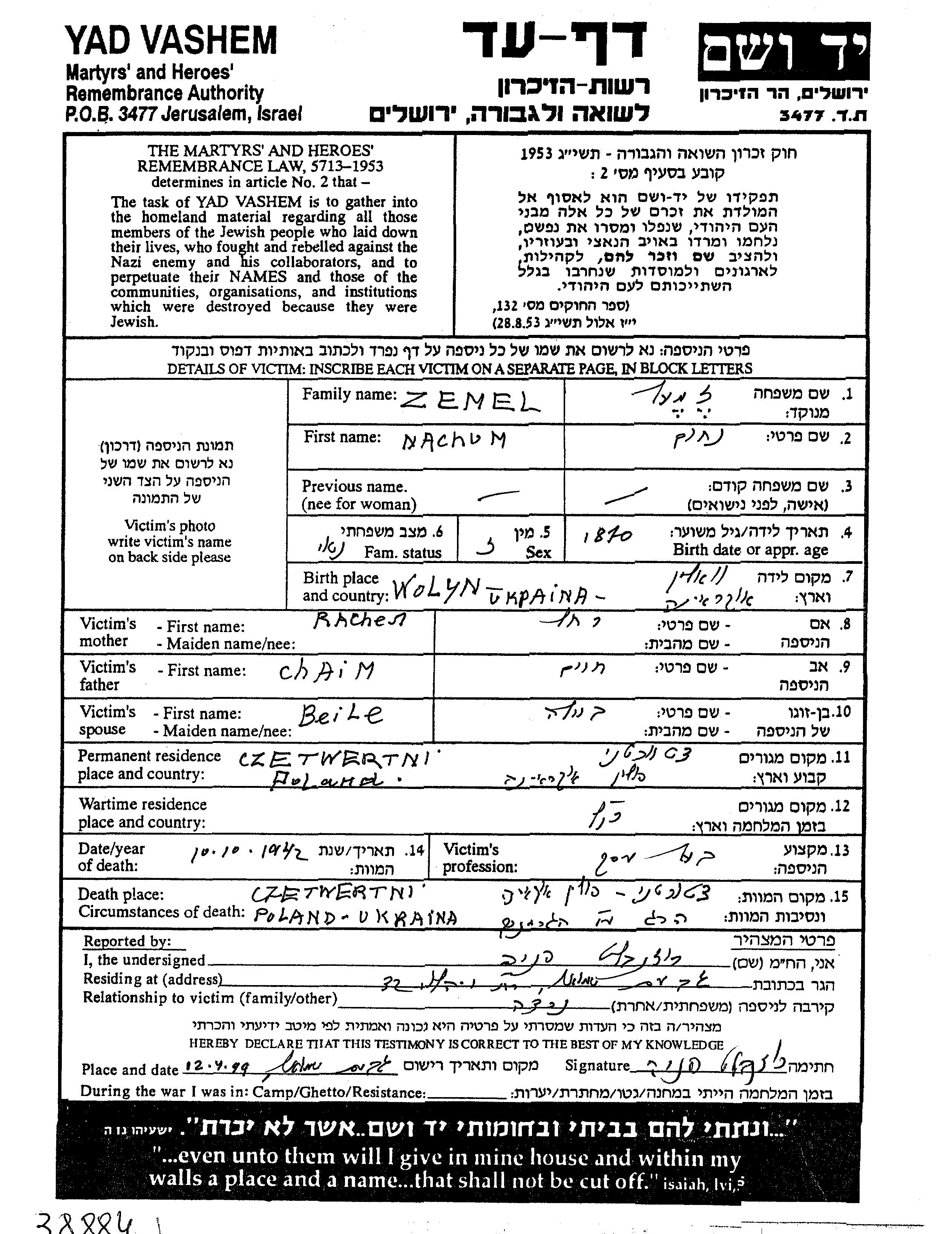 Nakhum Zemel was born in Wolyn, Poland, 1870 to Khaim and Rachel. He was a garage owner and married to Beila. Prior to WWII he lived in Czetwiertnia, Poland. During the war he was in Czetwiertnia, Poland. Nakhum was murdered in the Shoah. Place of death: Czetwiertnia, Poland, 10/10/1942.