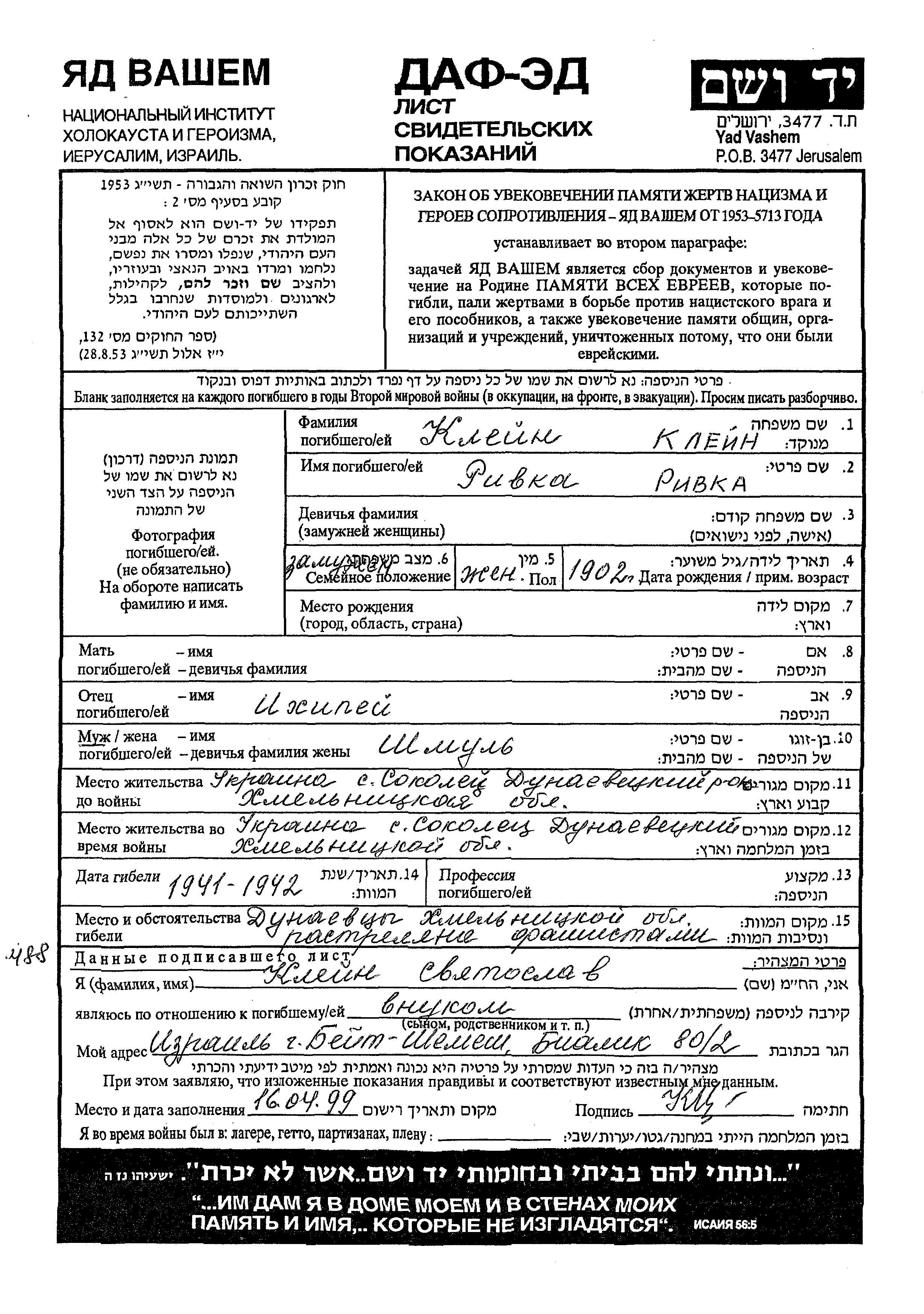 Rivka Klein was born, 1902 to Ikhilei. She was married to Shmul. Prior to WWII she lived in Sokolets, Ukraine (USSR). During the war she was in Sokolets, Ukraine (USSR). Rivka was murdered in the Shoah. Place of death: Dunayevtsy, Ukraine (USSR), 1941.