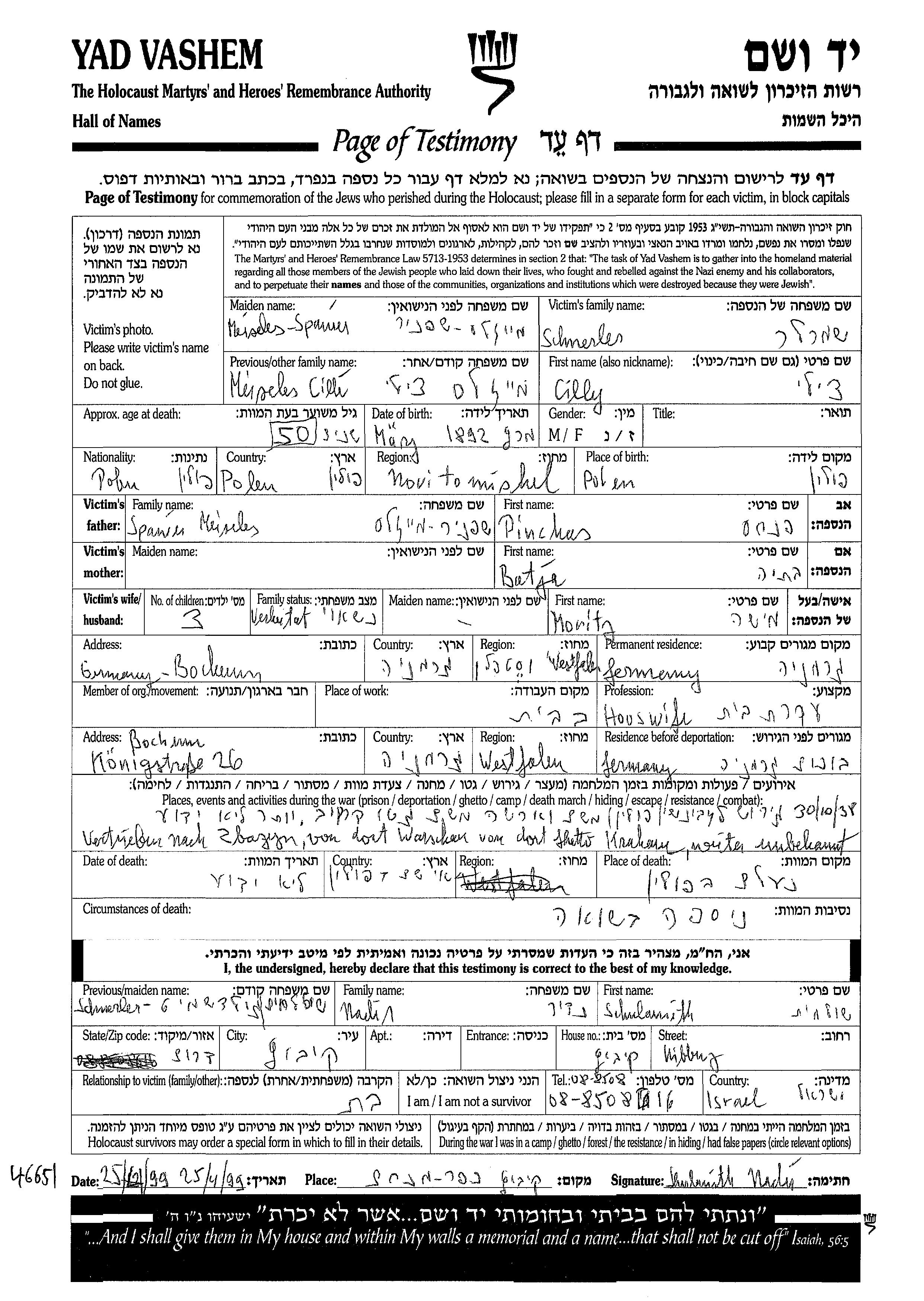 Cilly Schmerler nee Meizels Shpanier Spanier was born in Nowy Tomysl, Poland, 1892 to Pinkhas and Batia. She was a housewife and married to Moritz Moshe. Prior to WWII she lived in Bochum, Germany. During the war she was in Bochum, Germany. Cilly was murdered in the Shoah. Place of death: Poland.