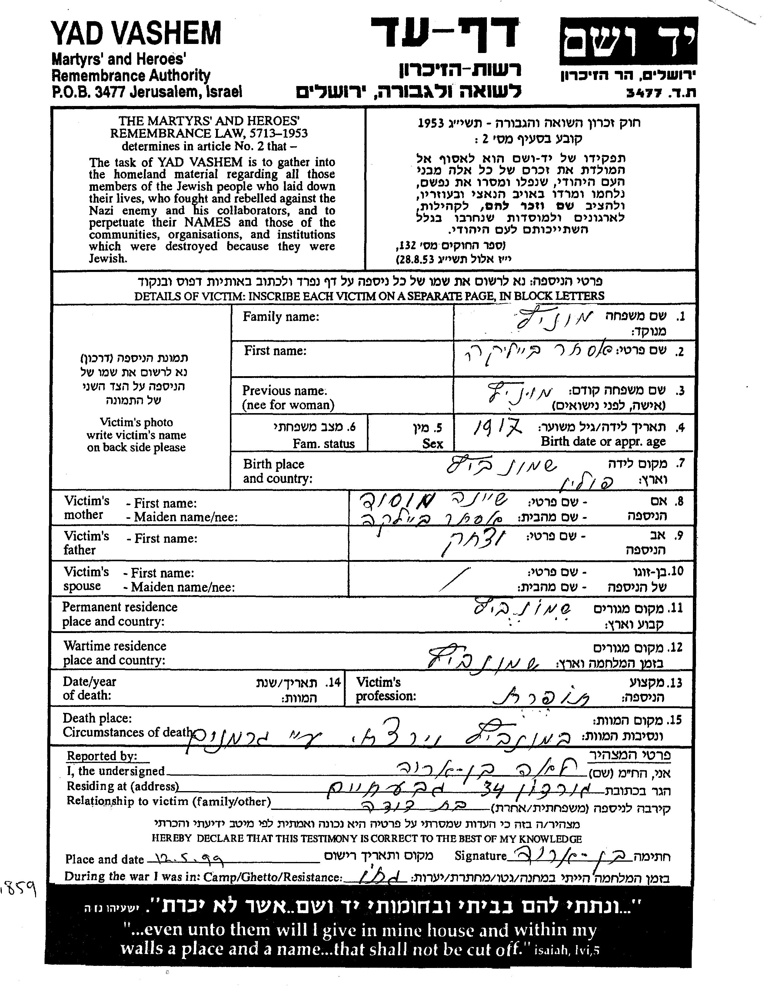 Ester Beilika Monitz was born in Siemionowicze, Poland, 1917 to Yitzkhak and Sheina Musia. She was a seamstress. Prior to WWII she lived in Siemionowicze, Poland. During the war she was in Siemionowicze, Poland. Ester Beilika was murdered in the Shoah. Place of death: Siemionowicze, Poland.