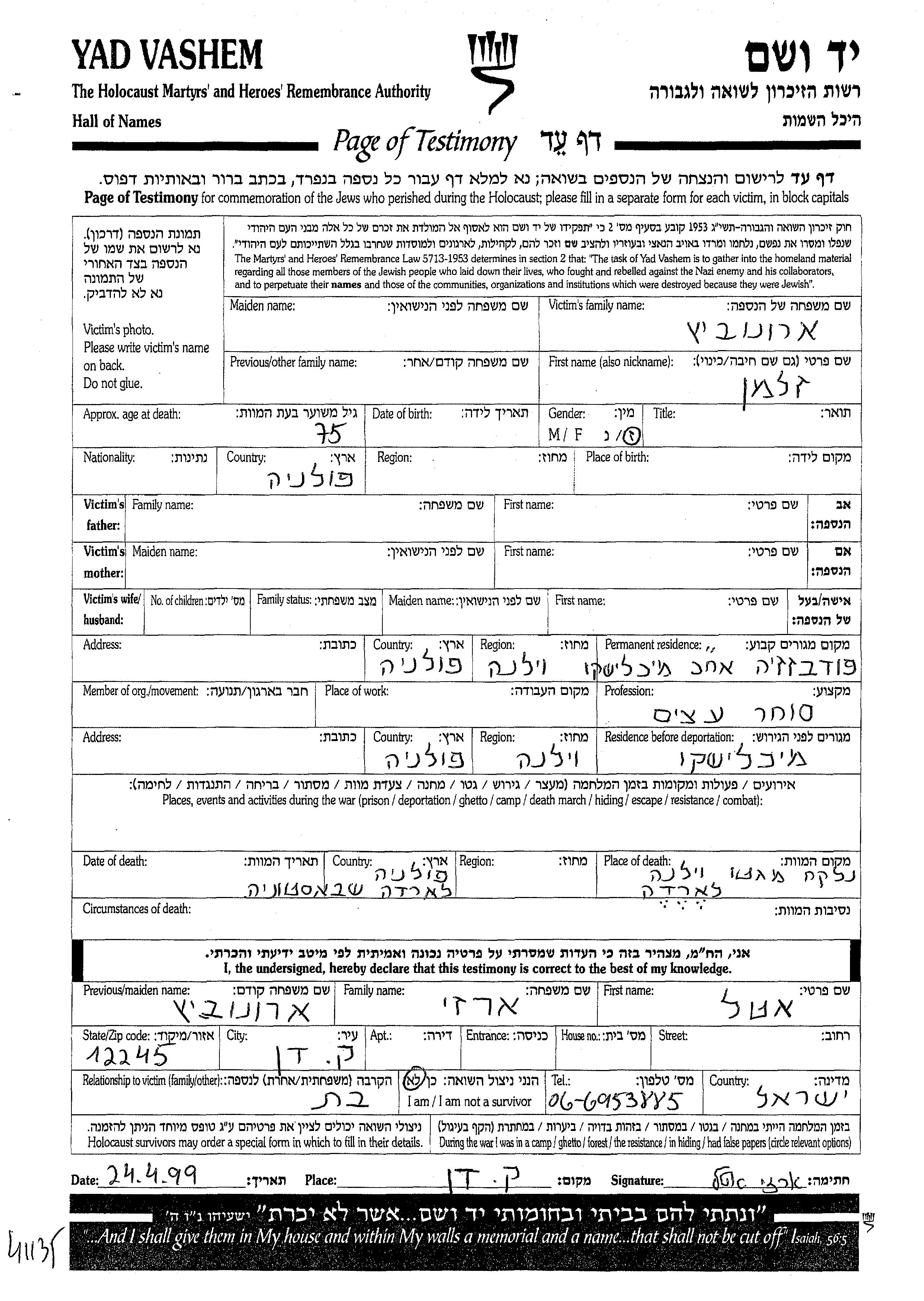 Zalman Aronovitz was born in Poland. He was a wood merchant and married. Prior to WWII he lived in Podbereze, Poland. During the war he was in Ghetto. Zalman was murdered in the Shoah. Place of death: Ereda, Estonia.