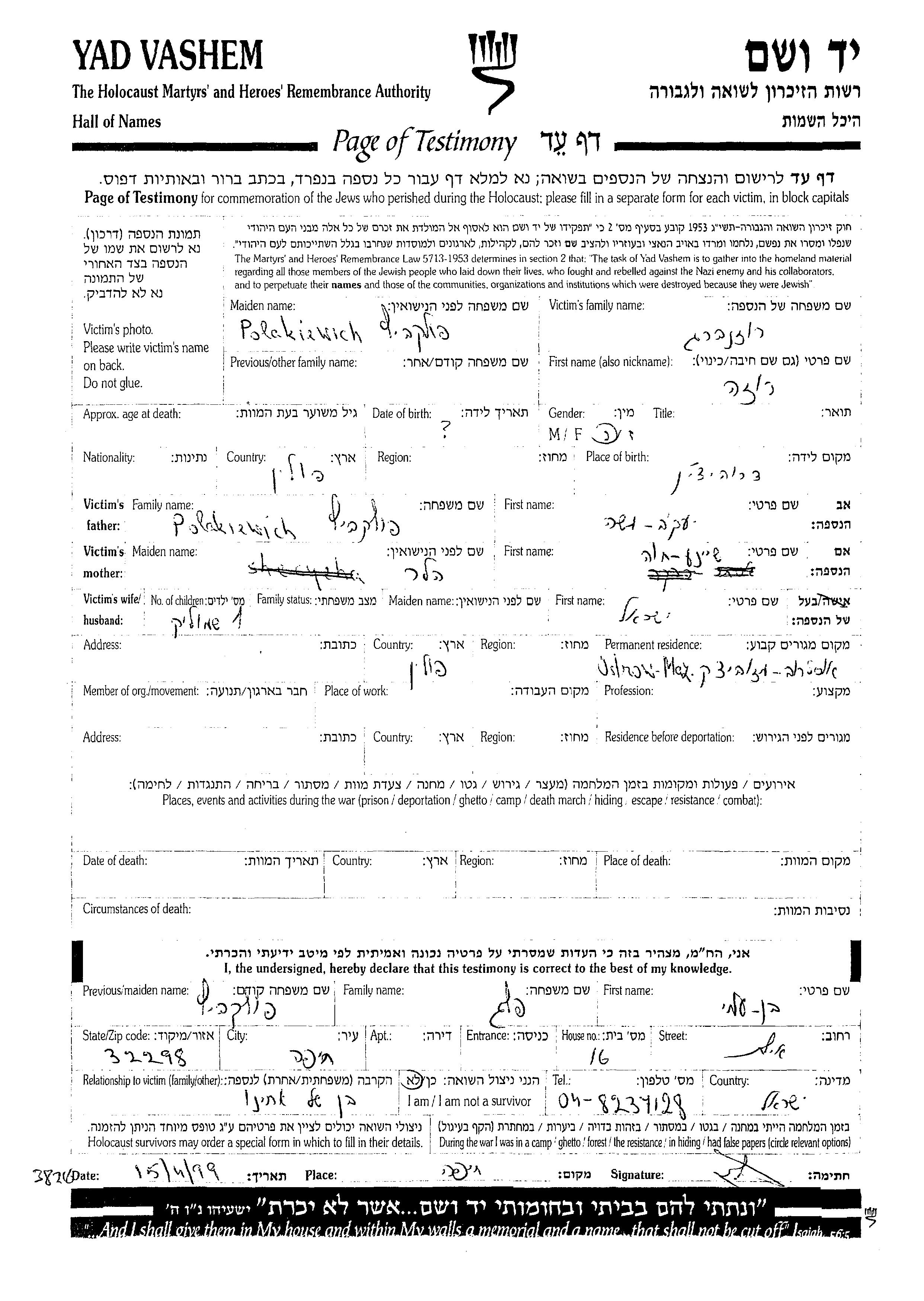 Roza Rozenberg nee Polakiewich was born in Drohiczyn, Poland to Moshe Yaakov and Khava Sheine nee Haler. She was married to Yisrael. Prior to WWII she lived in Ostrow Mazowiecki, Poland. Roza was murdered in the Shoah.