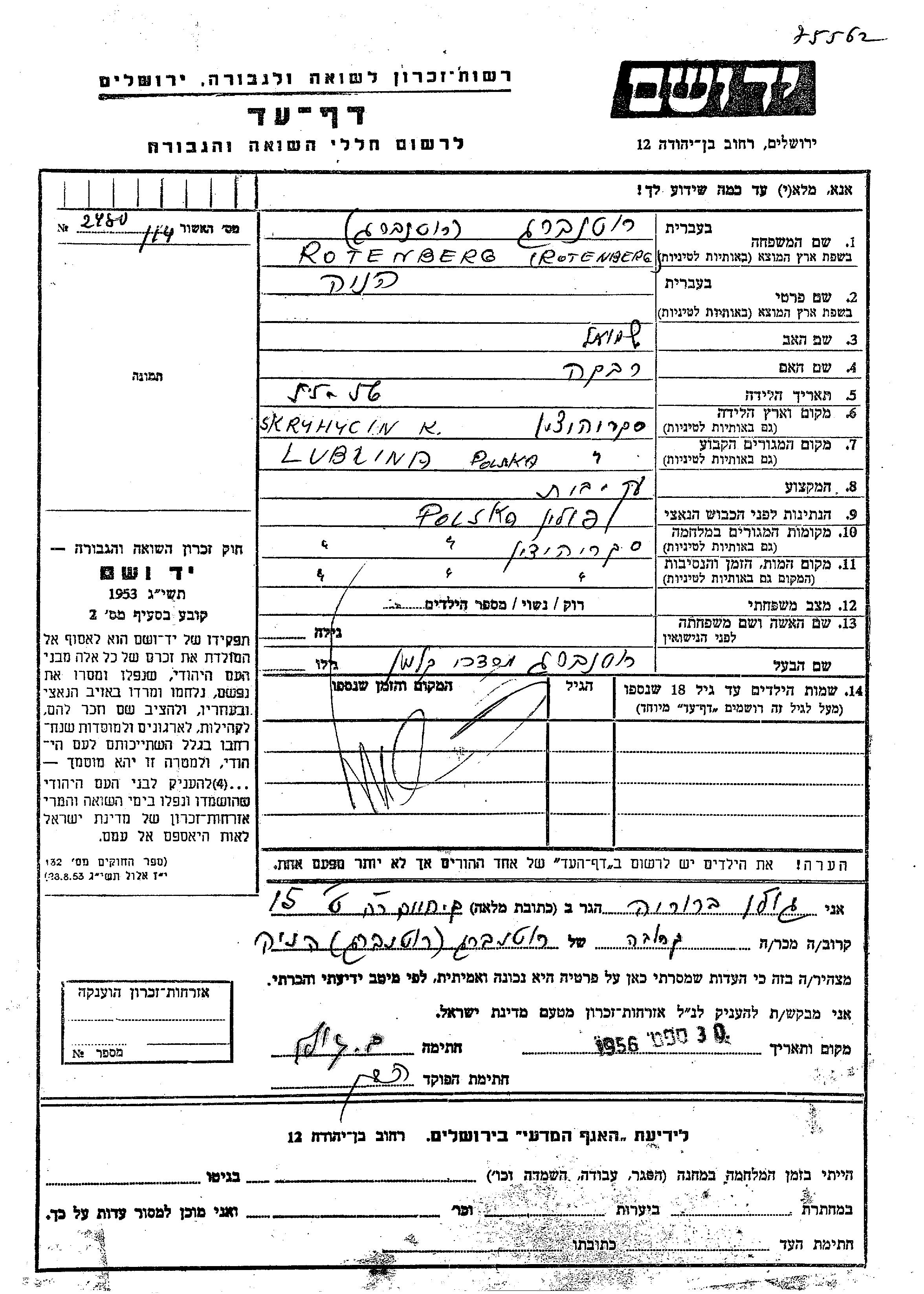 Henia Rotenberg was born in Skryhiczyn, Poland, 1855 to Shmuel and Rivka. She was a housewife and married to Mordekhai Kalman. Prior to WWII she lived in Lublin, Poland. During the war she was in Skryhiczyn, Poland. Henia was murdered in the Shoah. Place of death: Skryhiczyn, Poland.