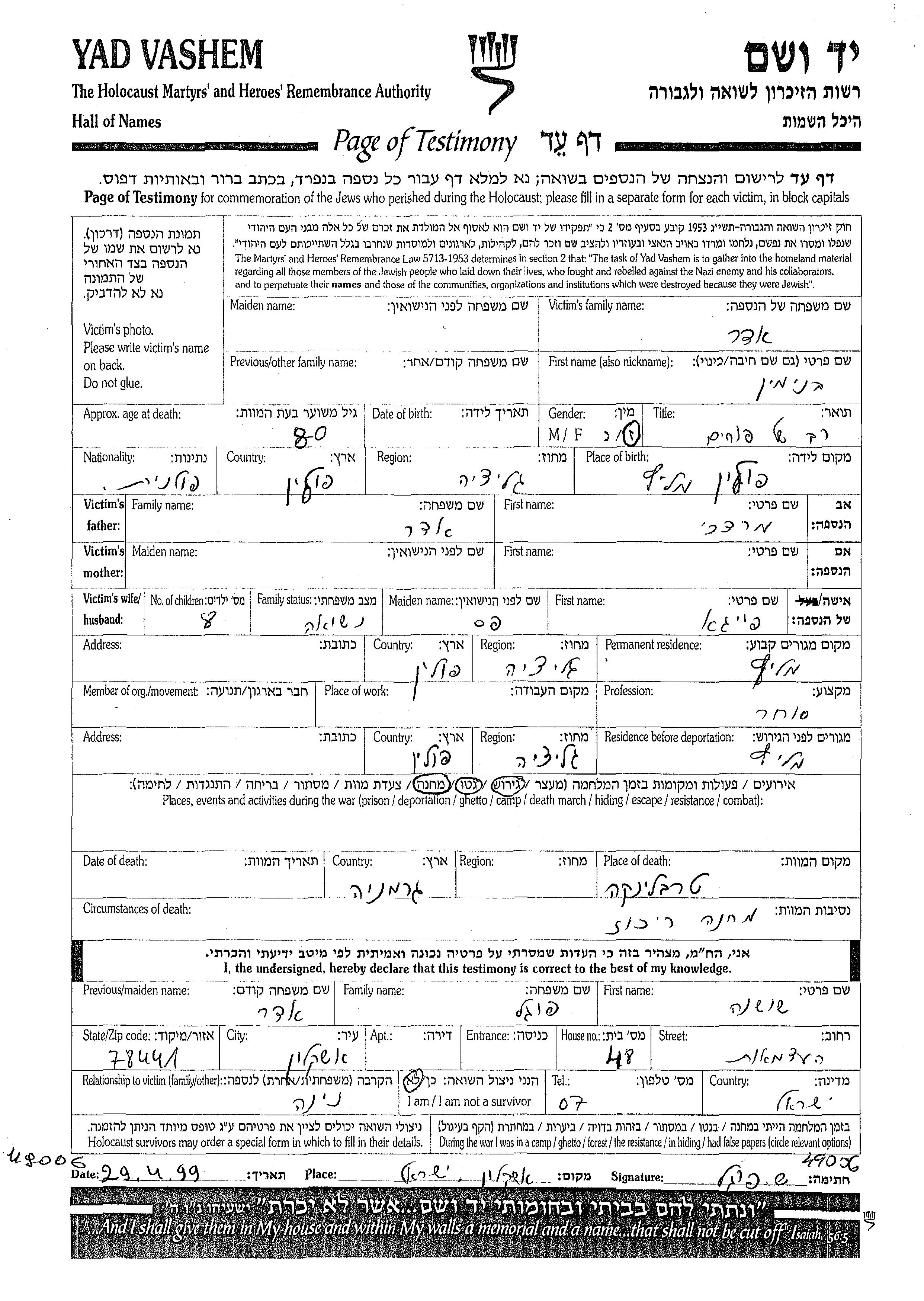 Yad Vashem - Pages of Testimony Names Memorial Collection