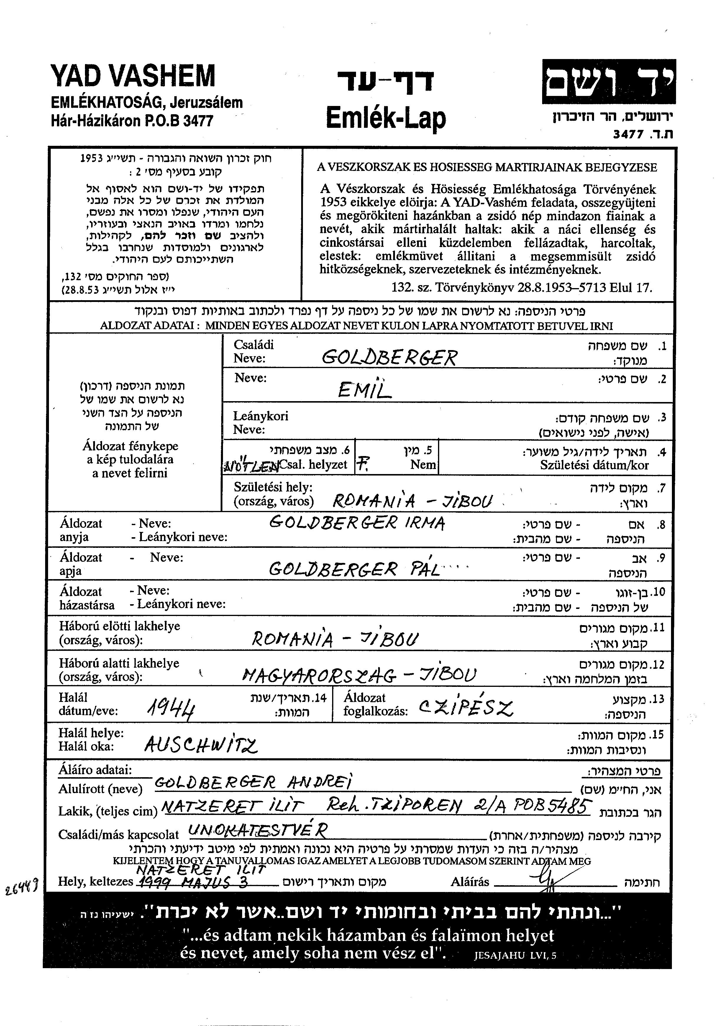 Emil Goldberger was born in Jibou, Romania to Pal and Irma. He was a shoemaker. Prior to WWII he lived in Jibou, Romania. During the war he was in Jibou, Romania.