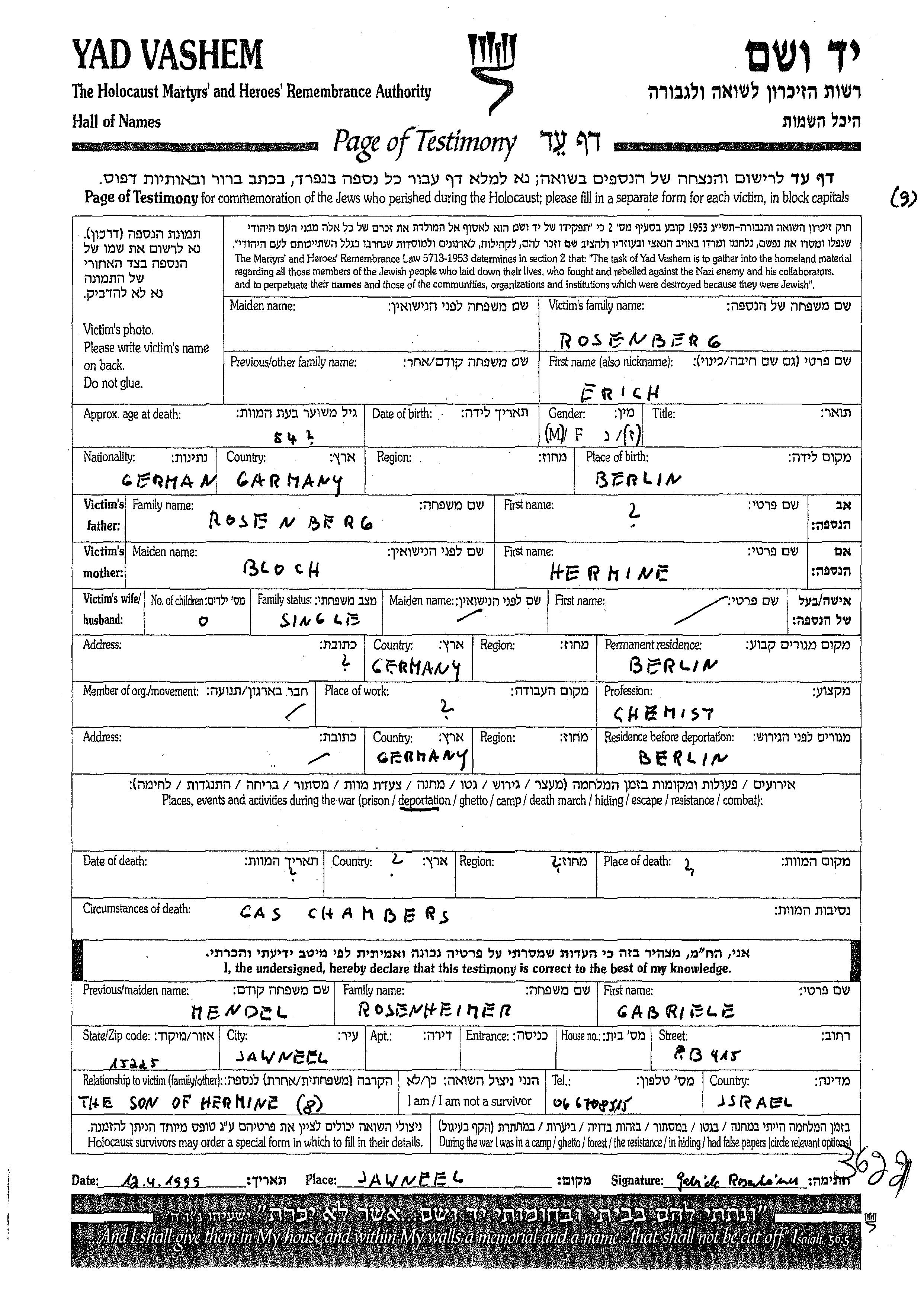 Rosenberg Erich Berlin, Germany Page of Testimony