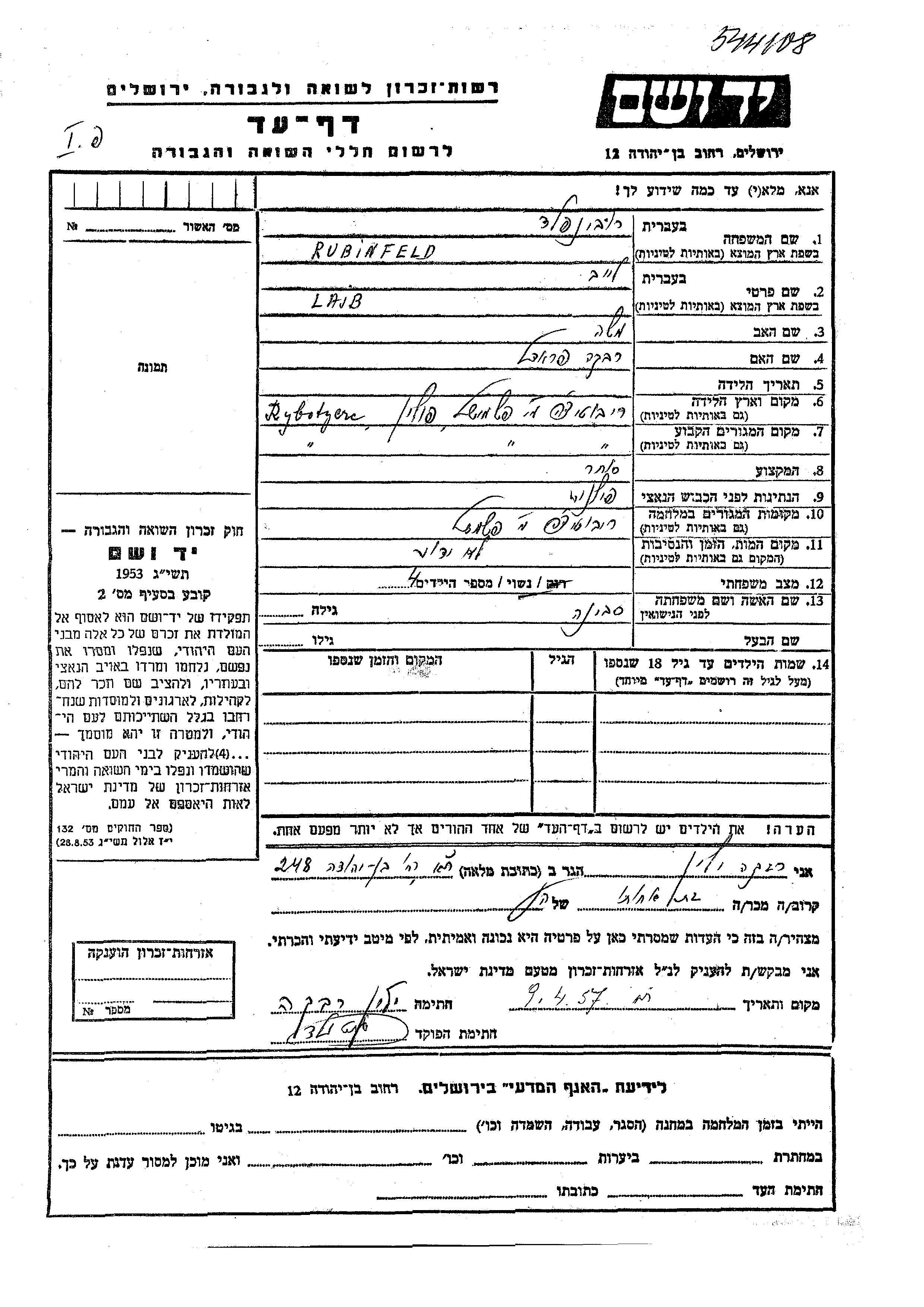 Lajb Rubinfeld was born in Rybotycze, Poland to Moshe and Rivka Fradel. He was a merchant and married to Sabina. Prior to WWII he lived in Rybotycze, Poland. During the war he was in Rybotycze, Poland. Lajb was murdered in the Shoah.