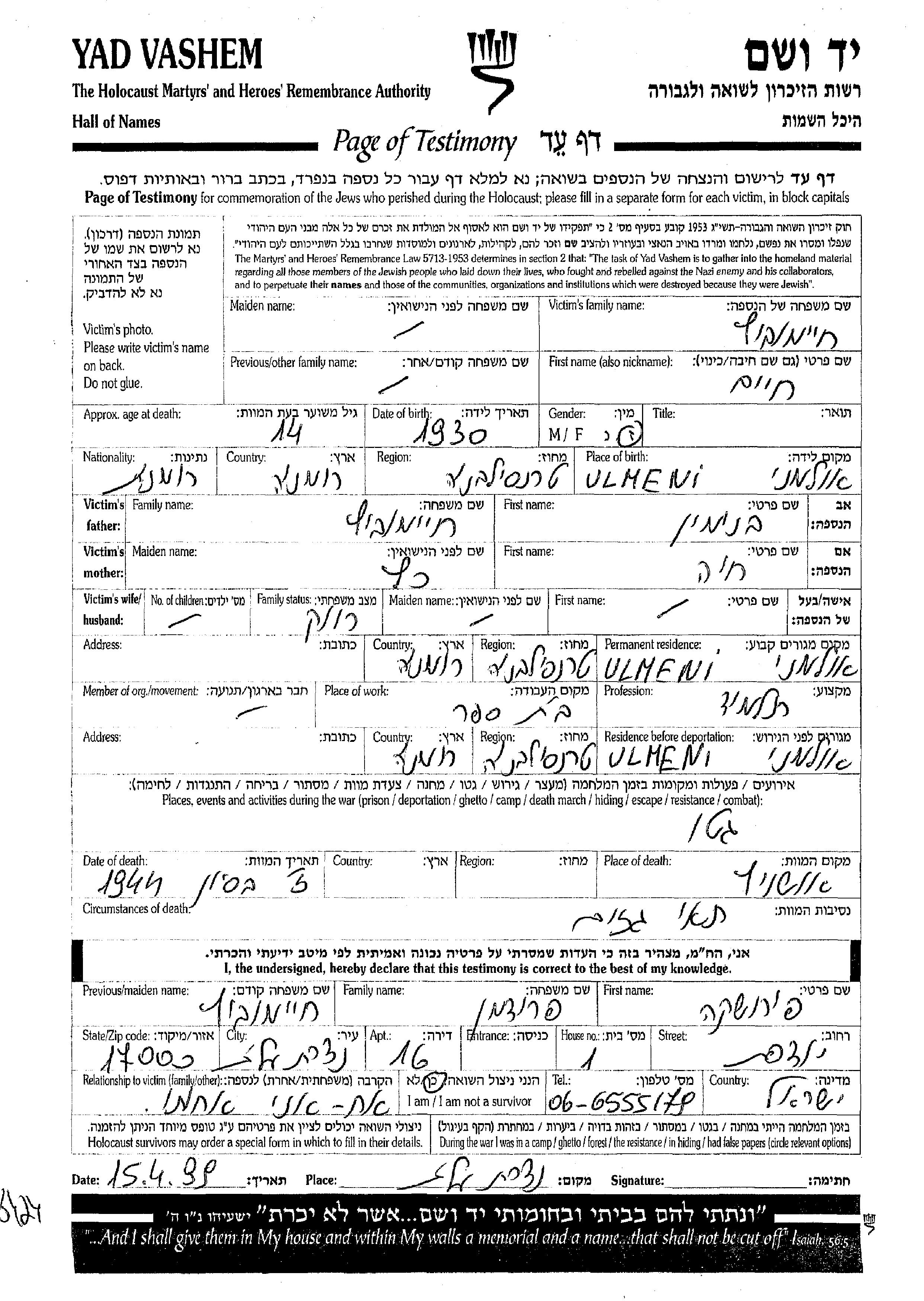 Yad Vashem - Pages of Testimony Names Memorial Collection