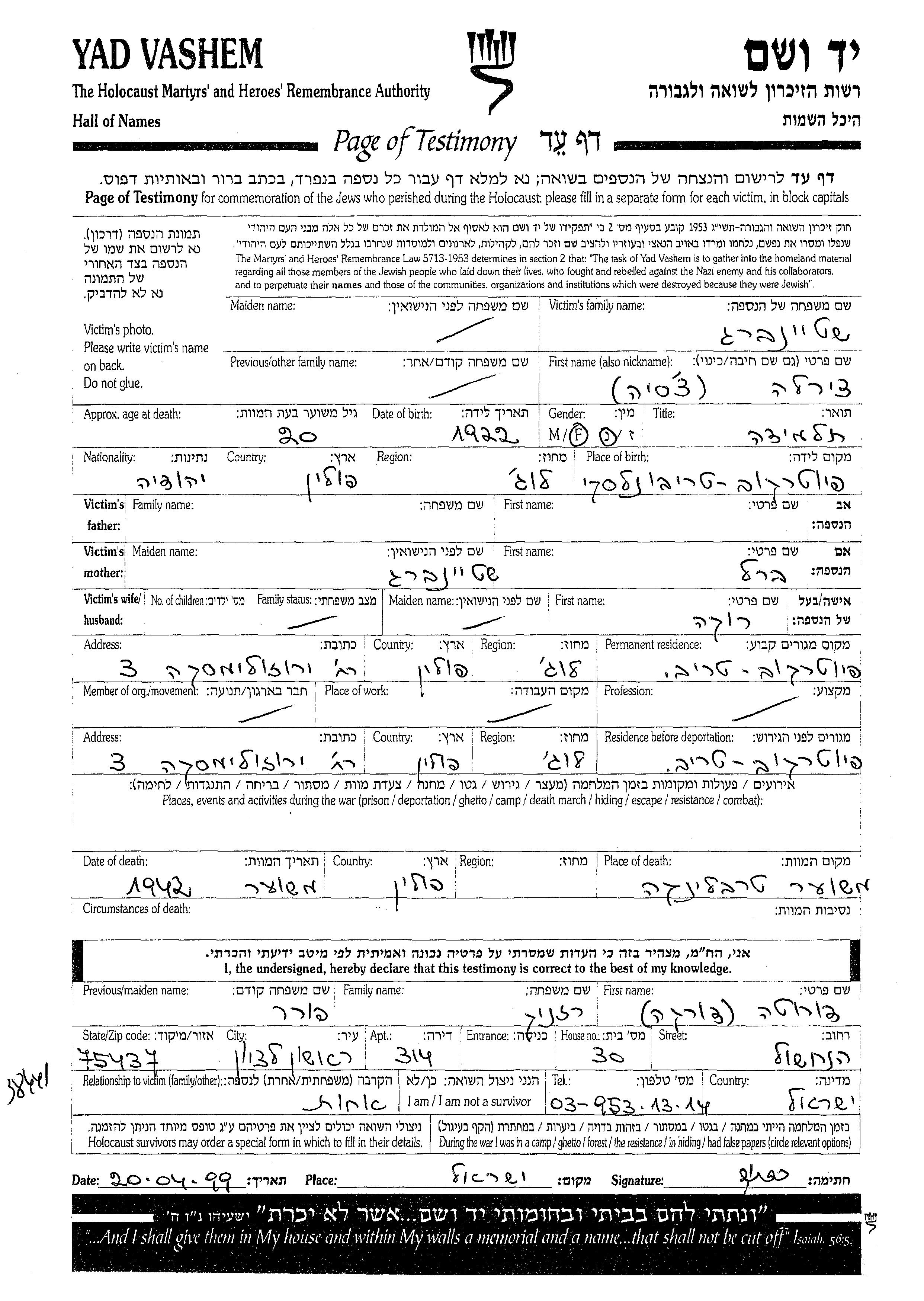 Tzirla Tzesia Shteinberg was born in Piotrkow Trybunalski, Poland, 1922 to Berl. She was a pupil and single. Prior to WWII she lived in Piotrkow Trybunalski, Poland. During the war she was in Piotrkow Trybunalski, Poland. Tzirla Tzesia was murdered in the Shoah. Place of death: Treblinka, Poland, 1942.