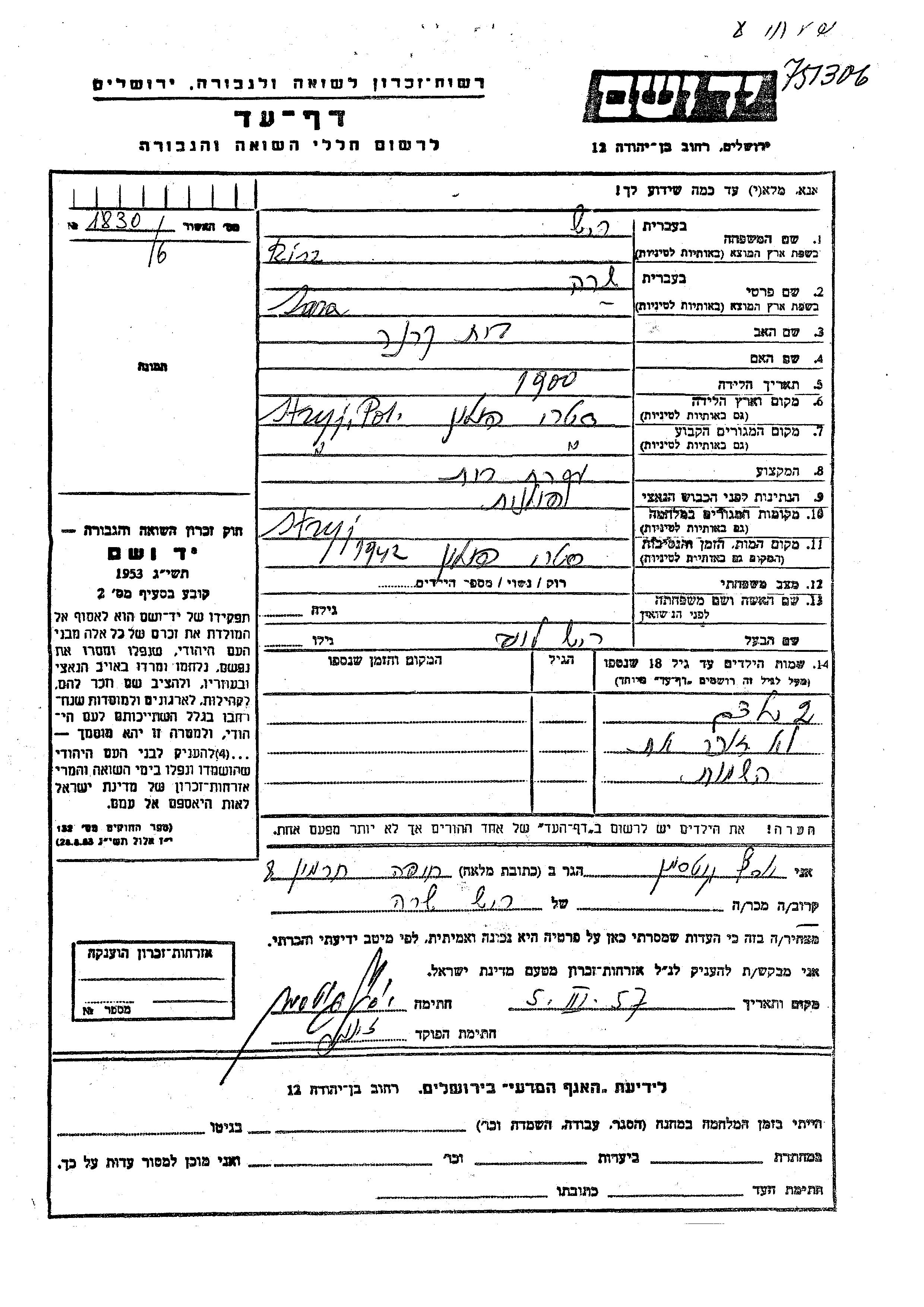 Yad Vashem - Pages of Testimony Names Memorial Collection