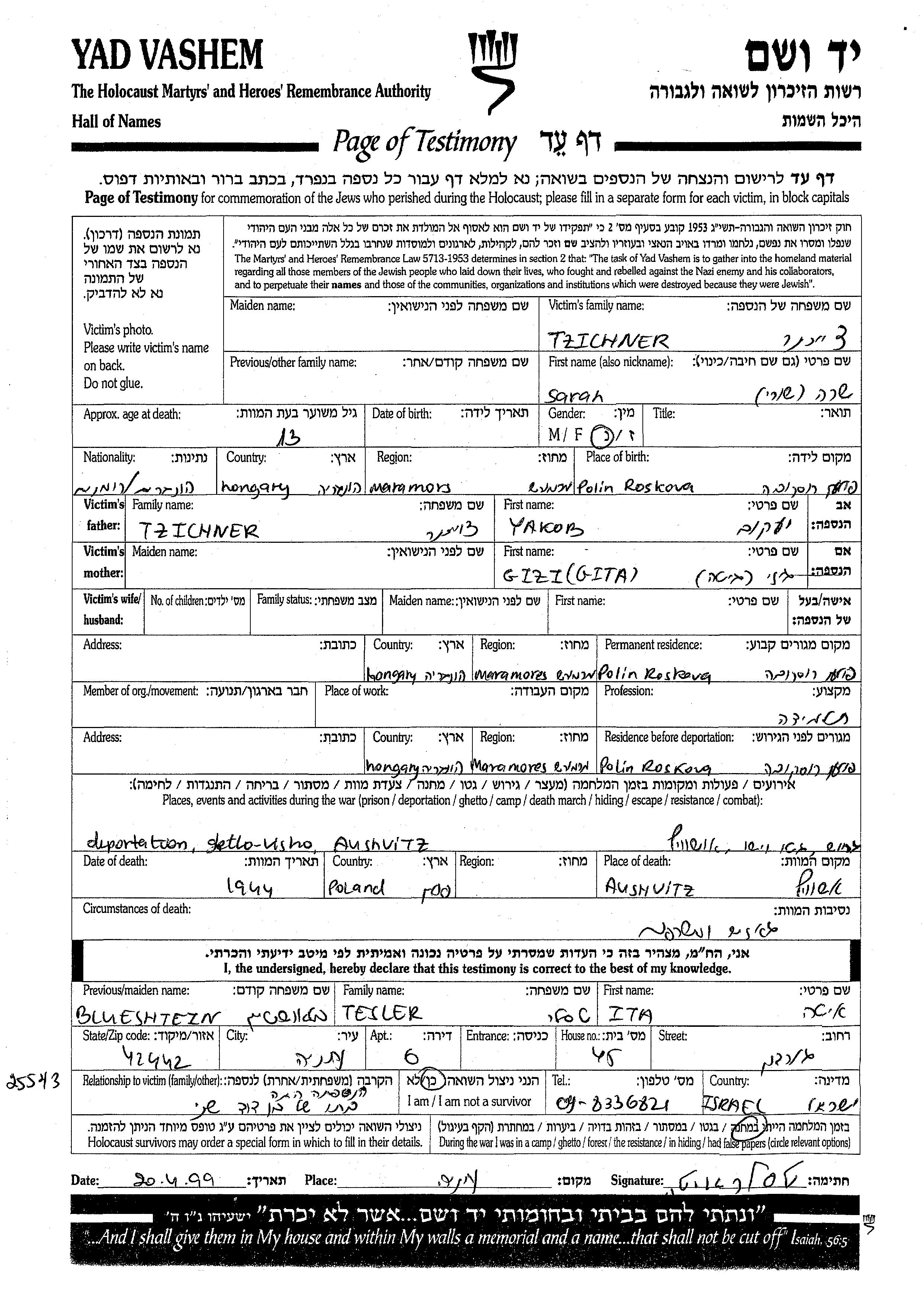 Yad Vashem - Pages of Testimony Names Memorial Collection