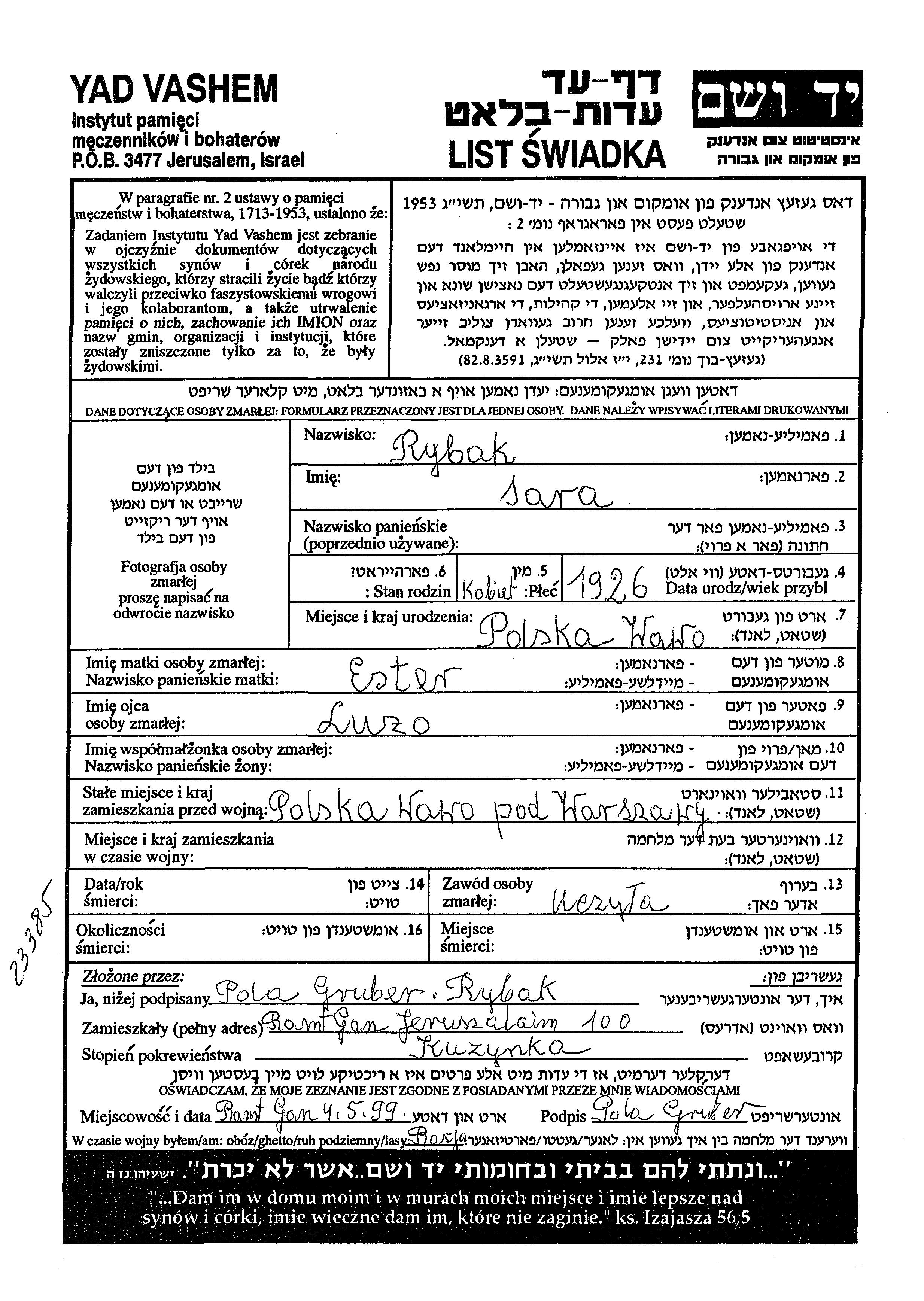 Rybak Sara 1926 Wawer, Poland Page of Testimony
