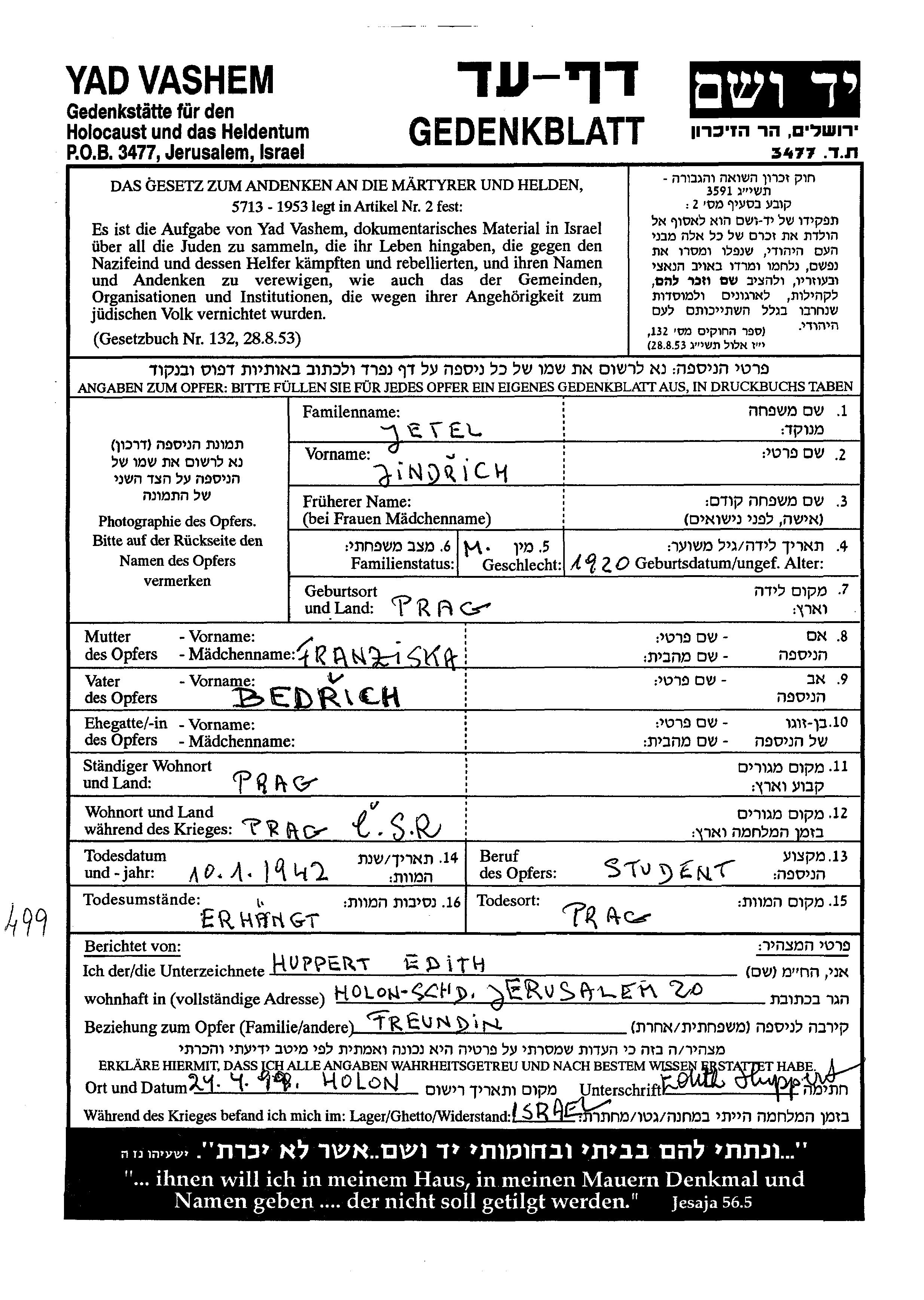Jetel Jindřich 1920 Prag, Czechoslovakia Page of Testimony