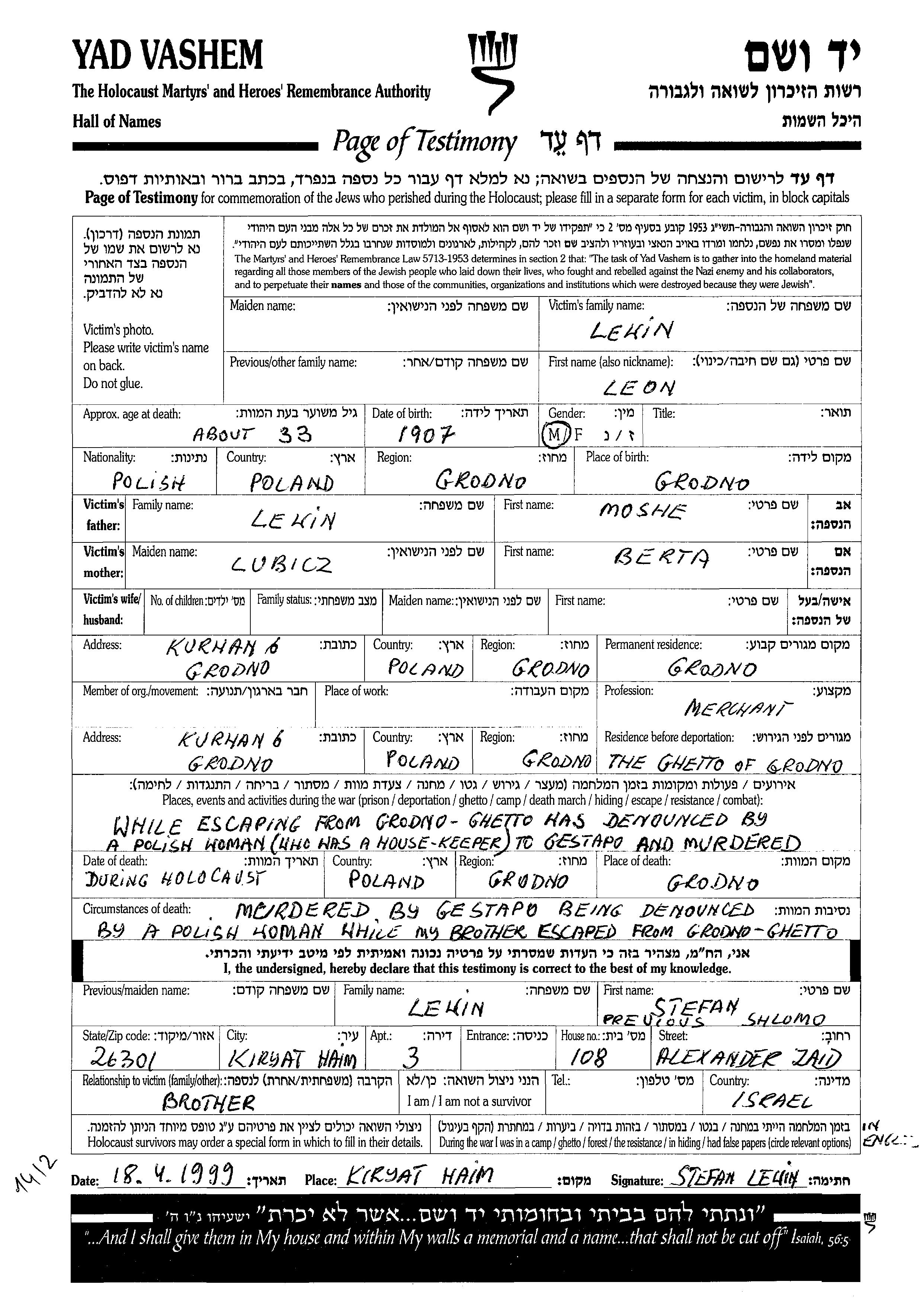 Leon Lewin was born in Grodno, Poland, 1907 to Moshe and Berta nee Lubicz. He was a merchant. Prior to WWII he lived in Grodno, Poland. During the war he was in Grodno, Poland.